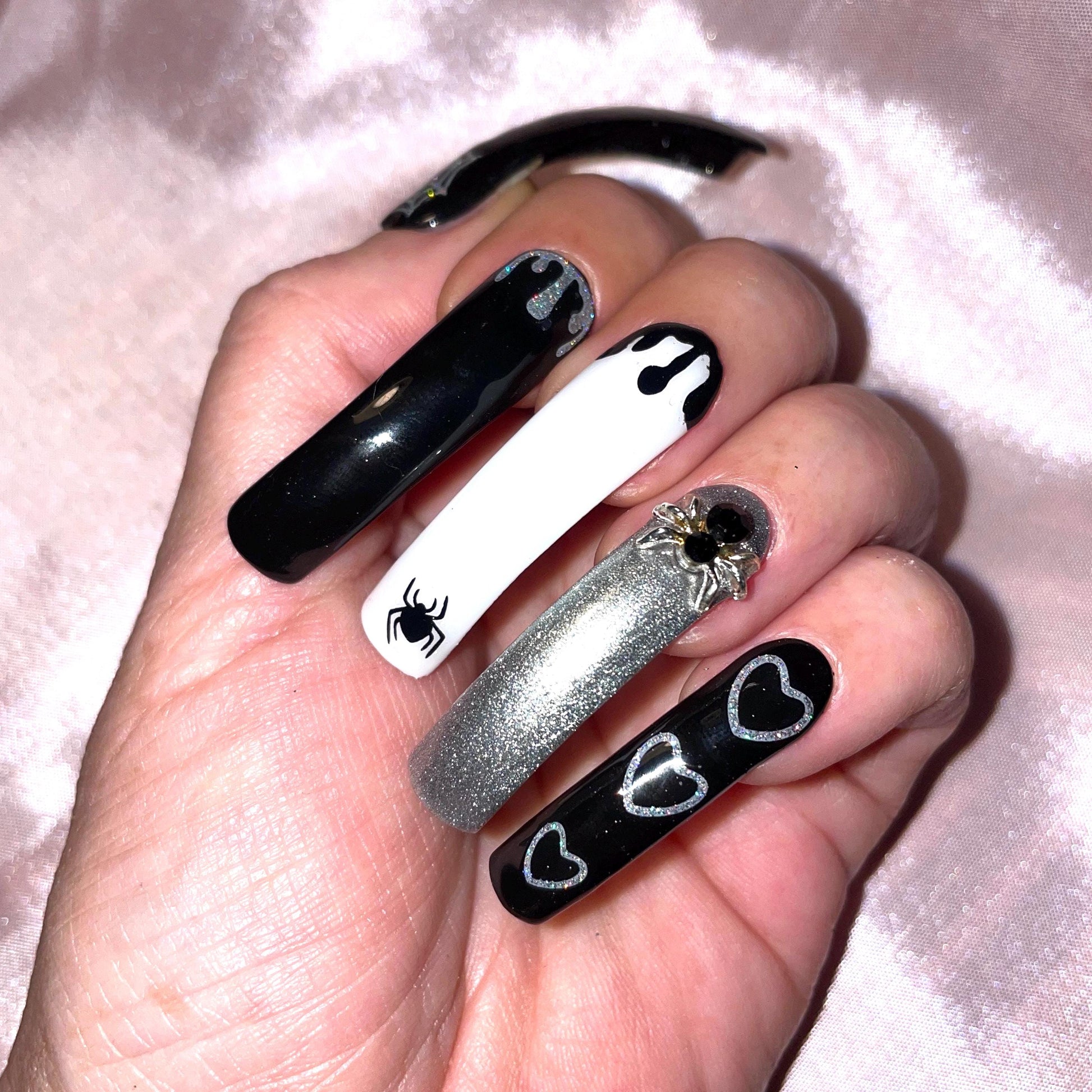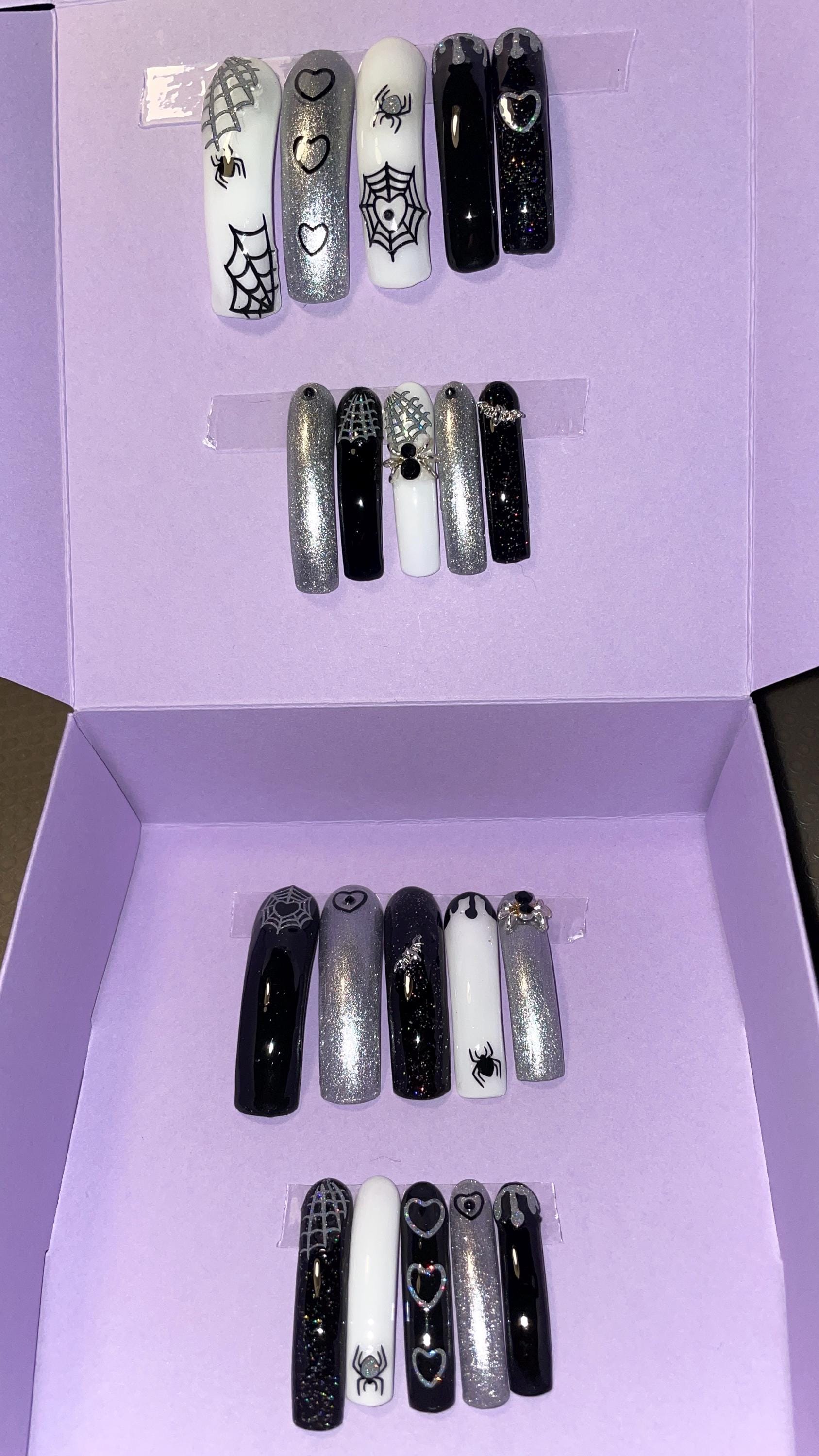 Noir, argent et blanc. Toile, araignées 3D, paillettes. Kit toutes tailles incluses. Réutilisables, Press-on nails, faux ongles. Finition brillante.