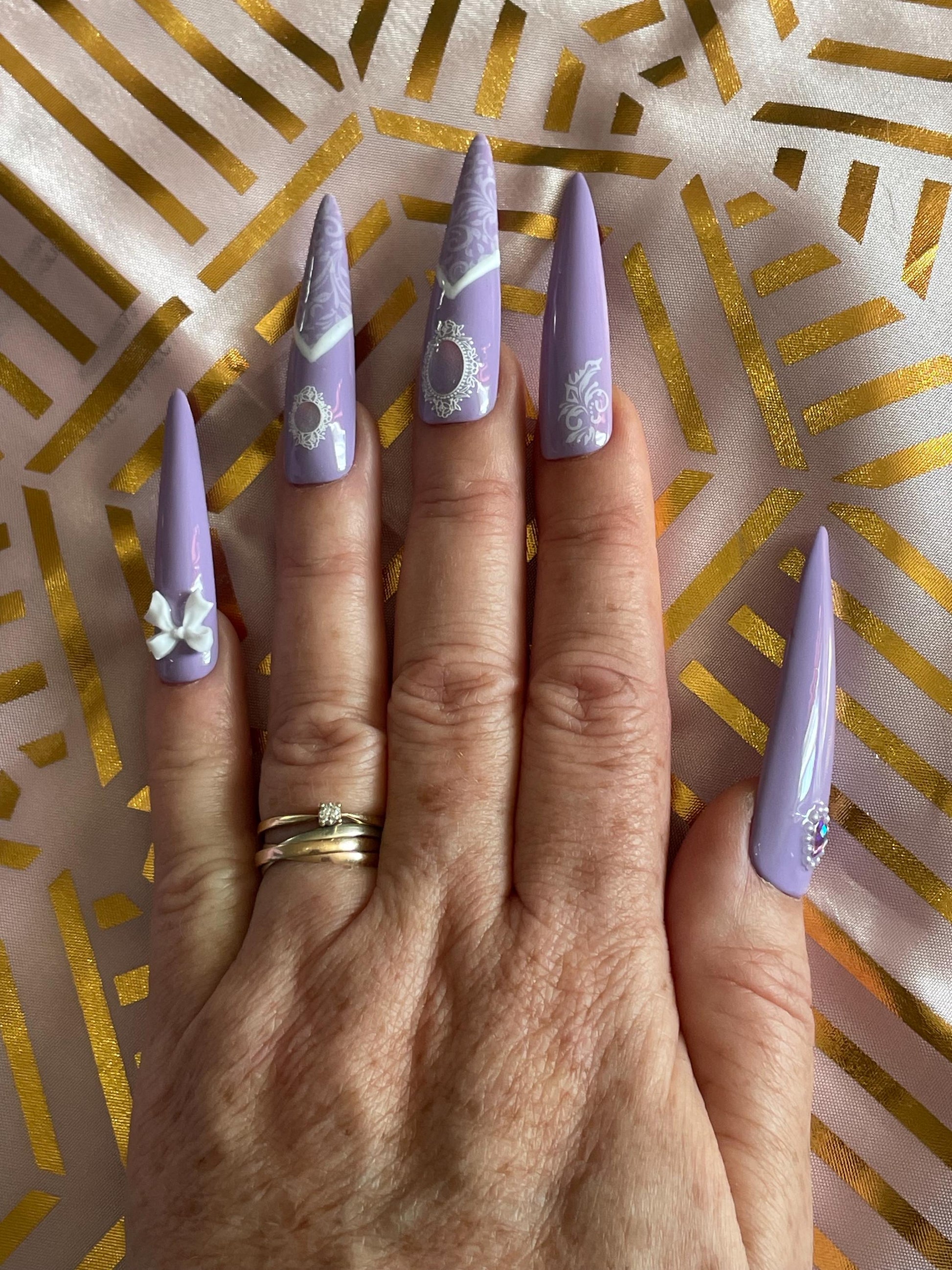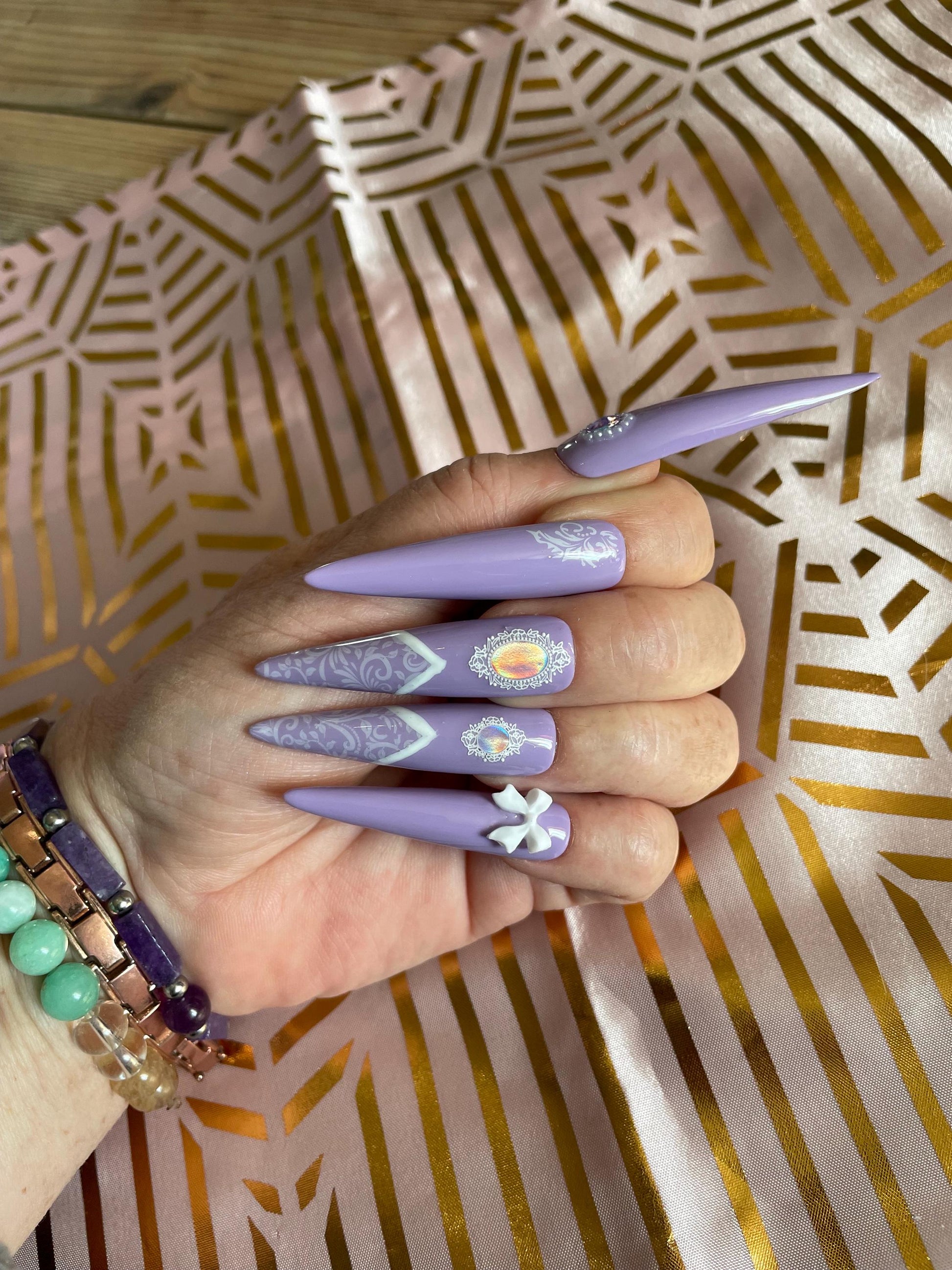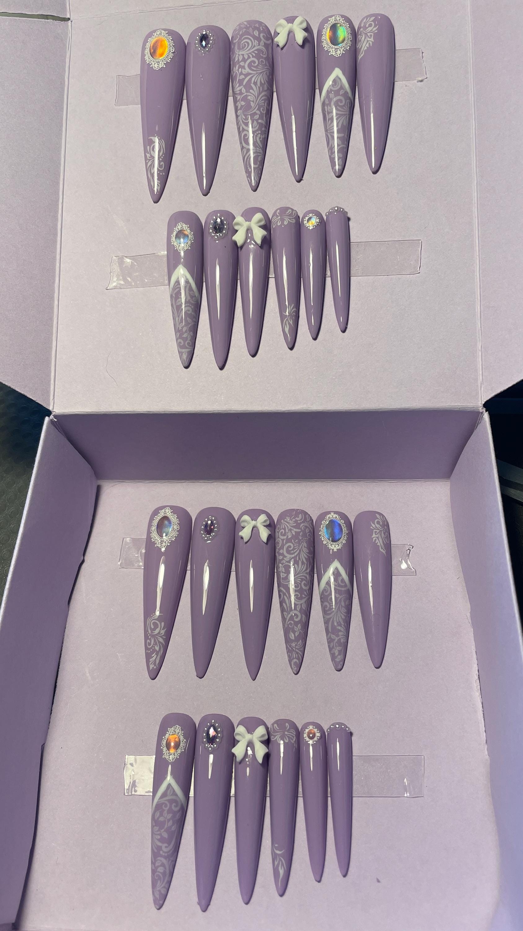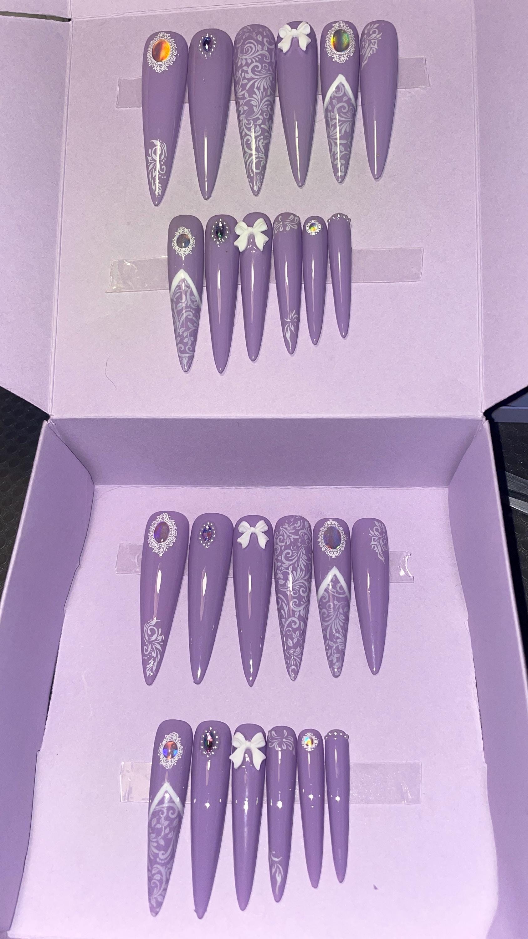 Dentelle blanche et violet avec petits noeuds et perles. Kit toutes tailles incluses. Réutilisables. Press-on nails, faux ongles. Finition brillante.