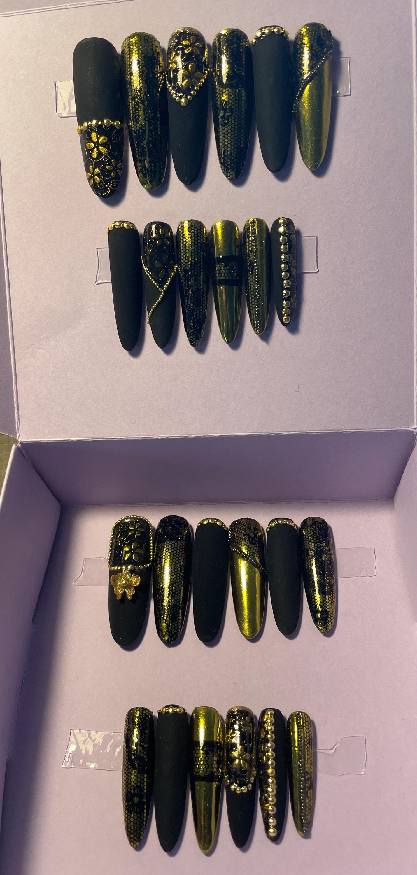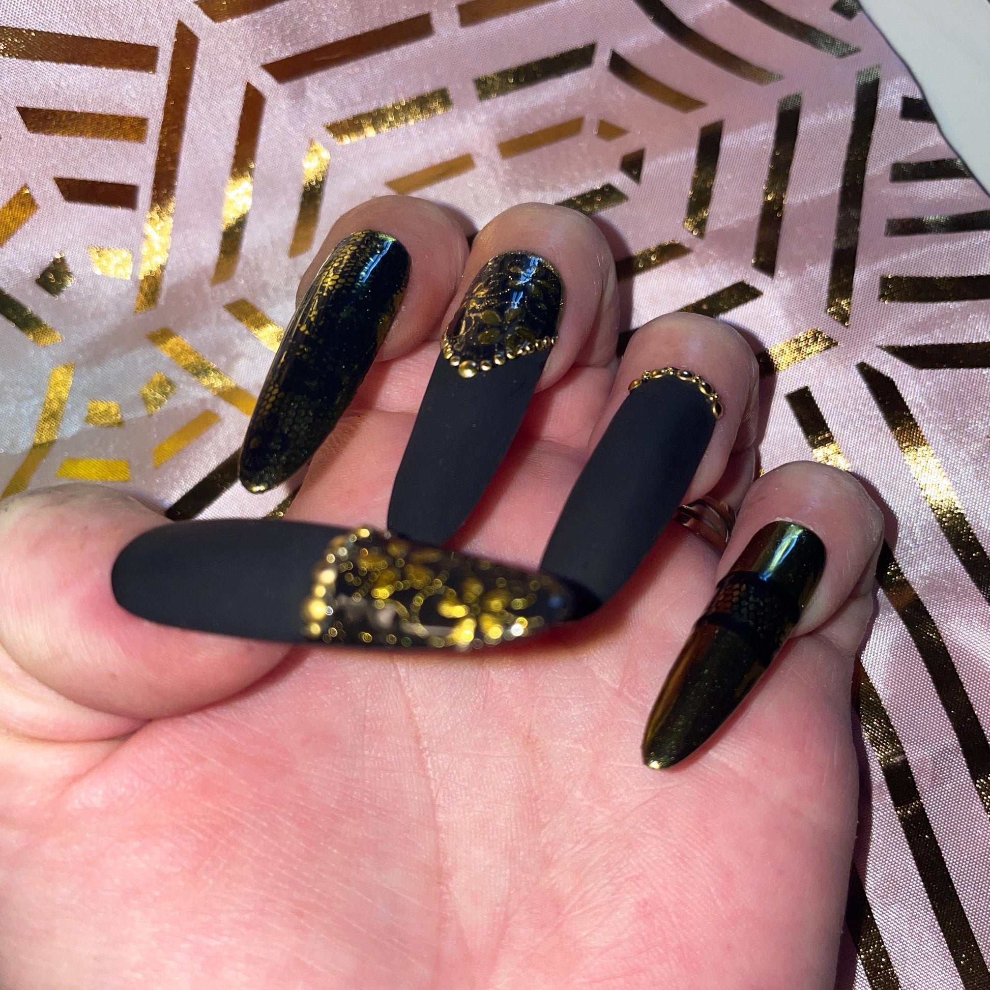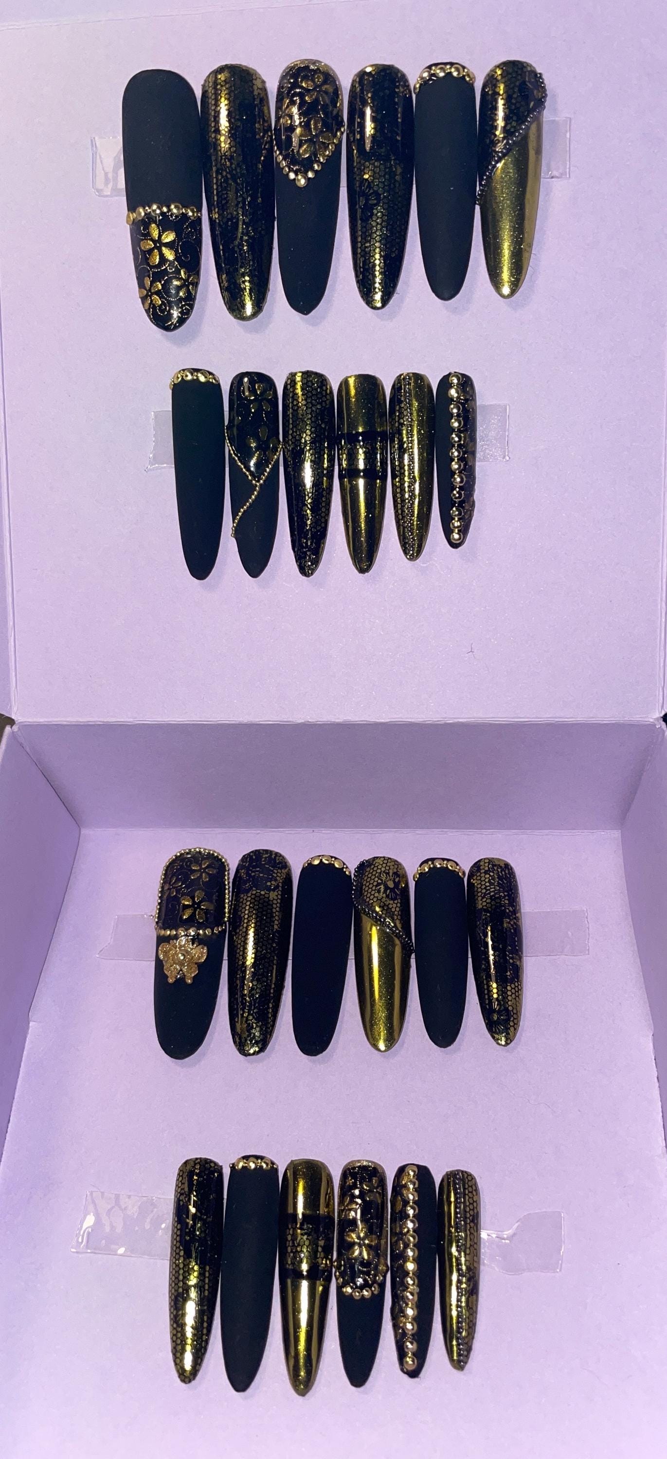 Dentelle or et noir, perles. Kit toutes tailles incluses. Réutilisables, Press-on nails, faux ongles. Finition mate et brillante
