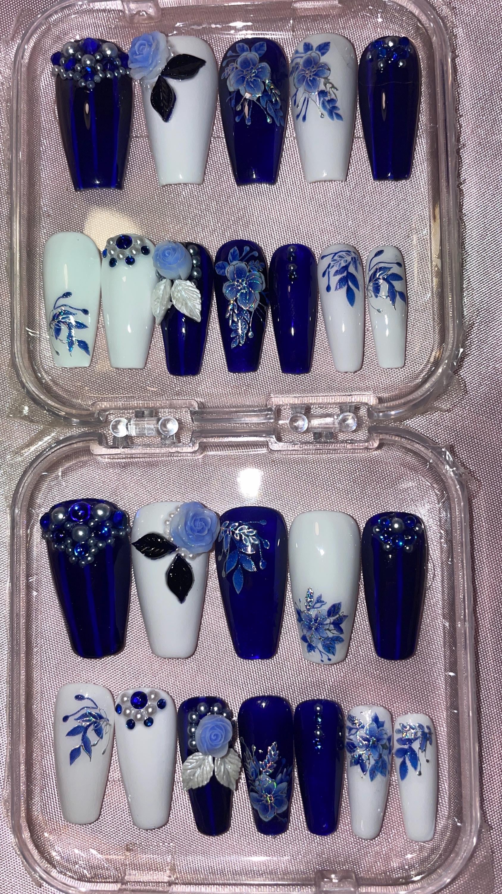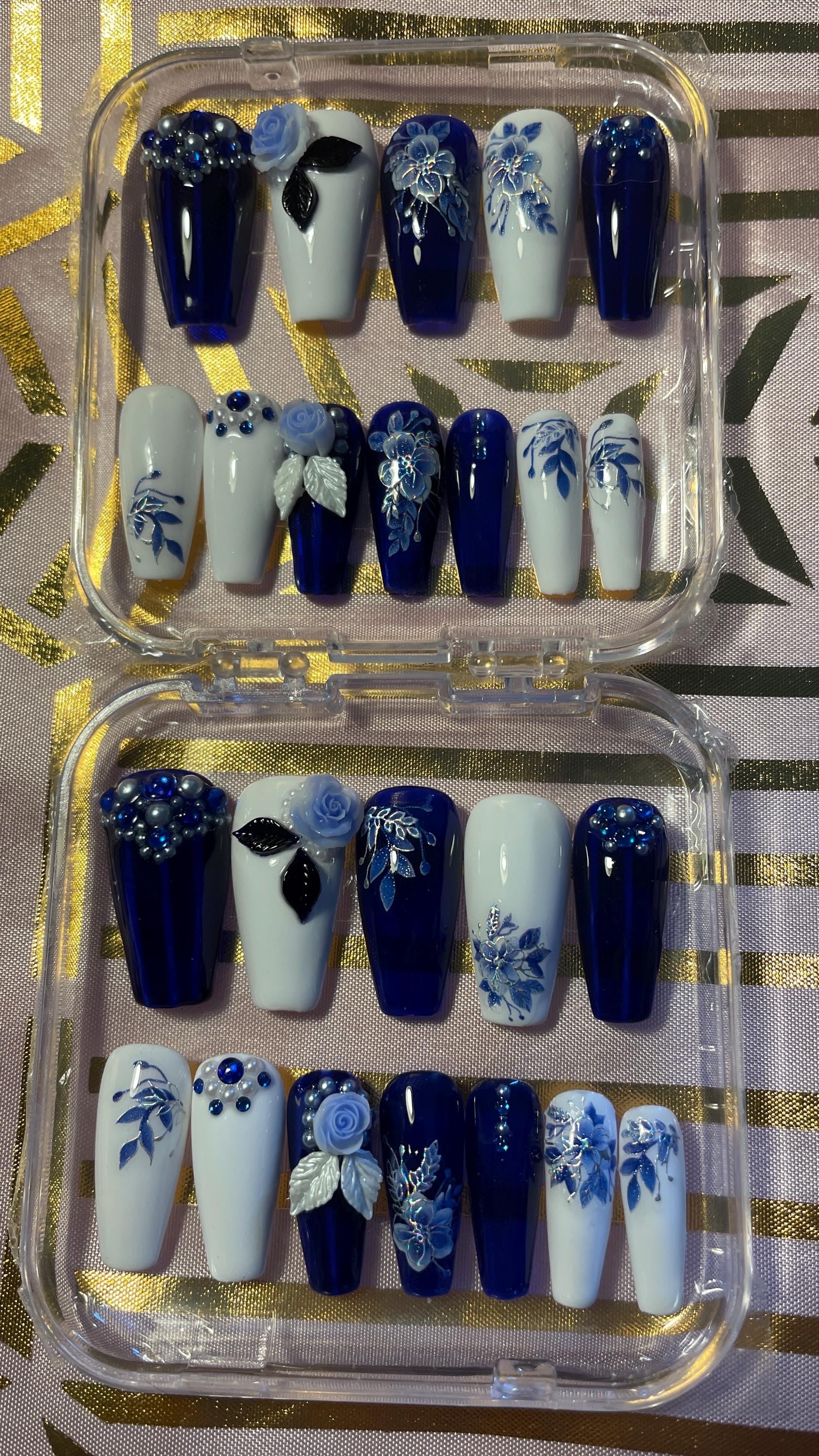 Fleurs bleues, et argent. Bleu jelly et blanc. Kit toutes tailles incluses. Réutilisables. Press-on nails, faux ongles. Finition brillante.