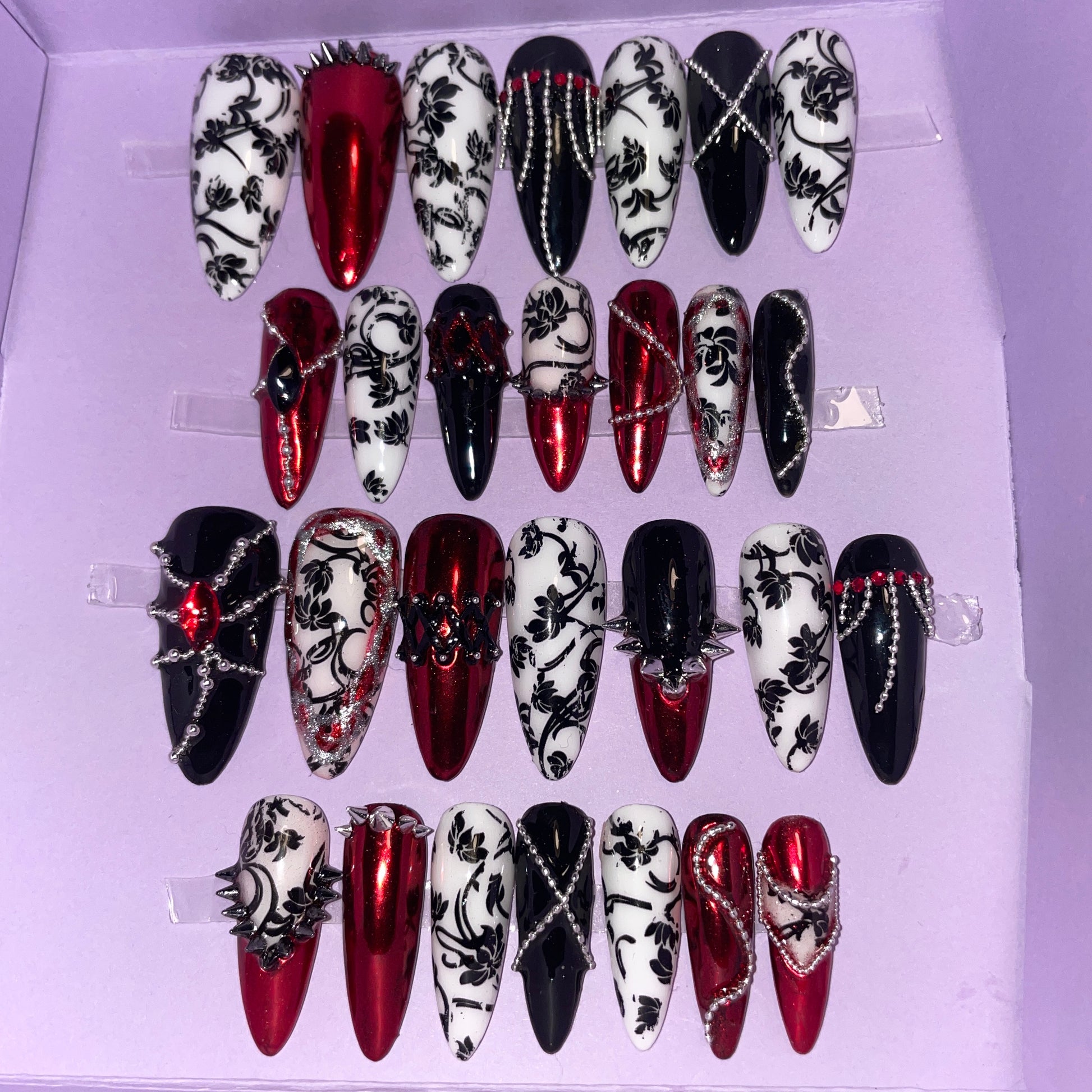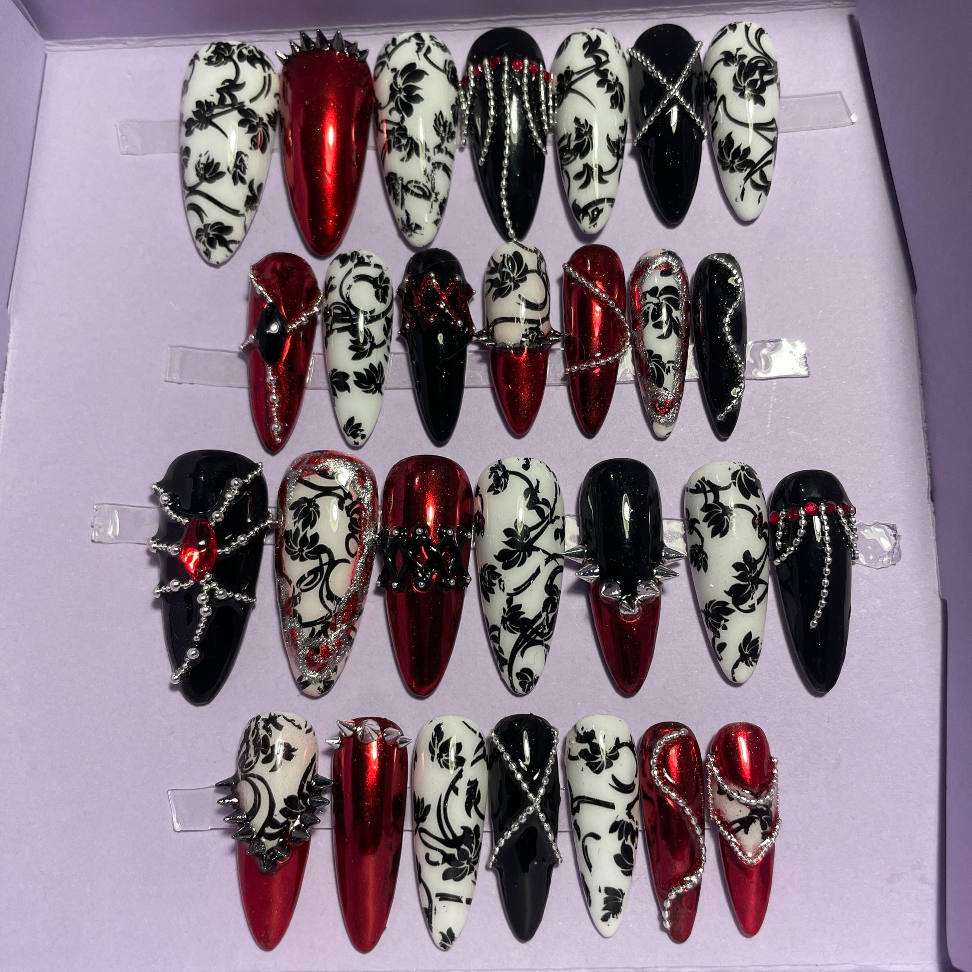 Noir, rouge chromé, blanc avec motifs, chaînes. Kit toutes tailles incluses. Réutilisables, Press-on nails, faux ongles. Fini brillant