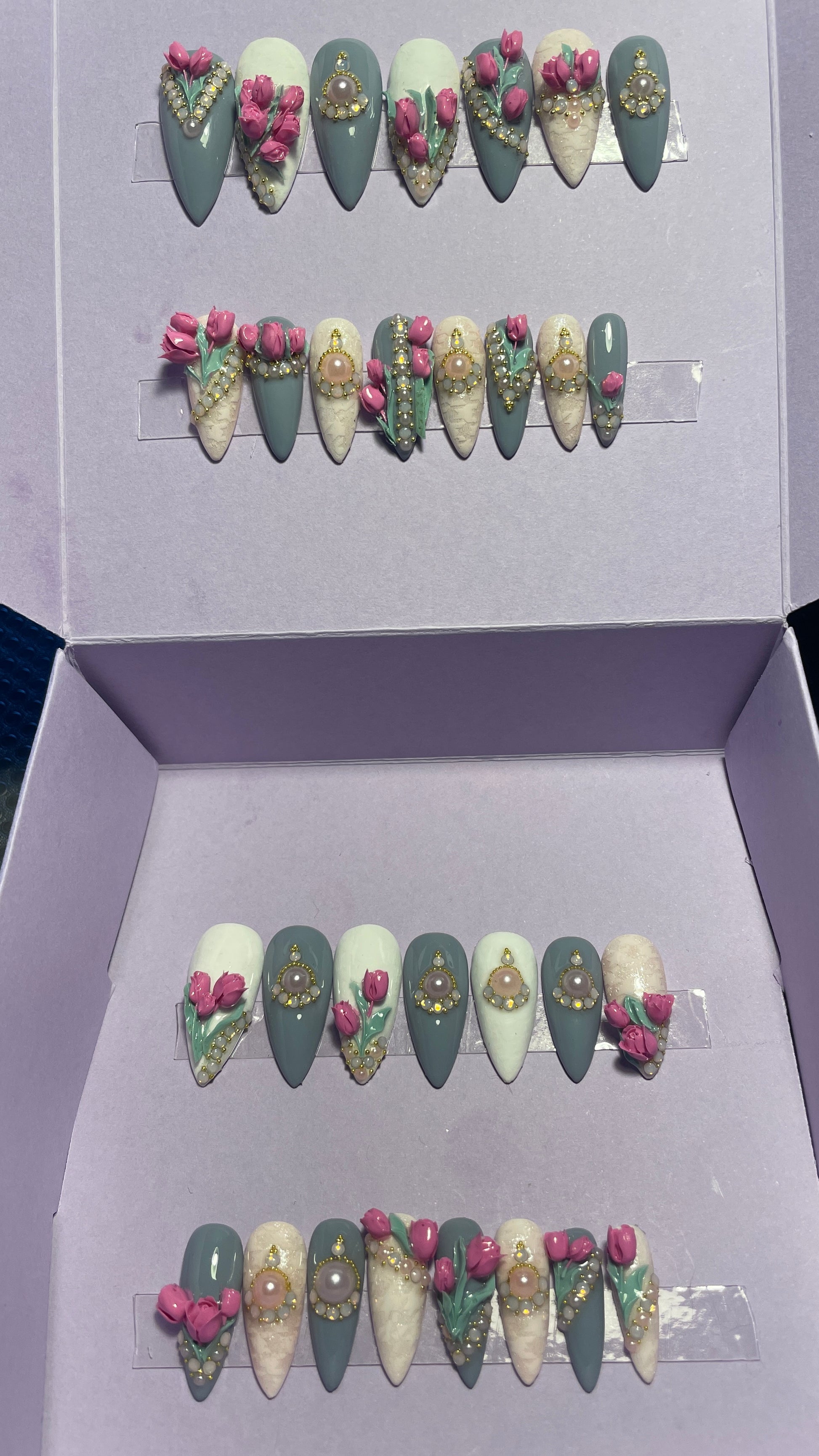 Gris et blanc, petites tulipes roses et strass. Kit toutes tailles incluses. Réutilisables. Press-on nails, faux ongles. Fini brillant