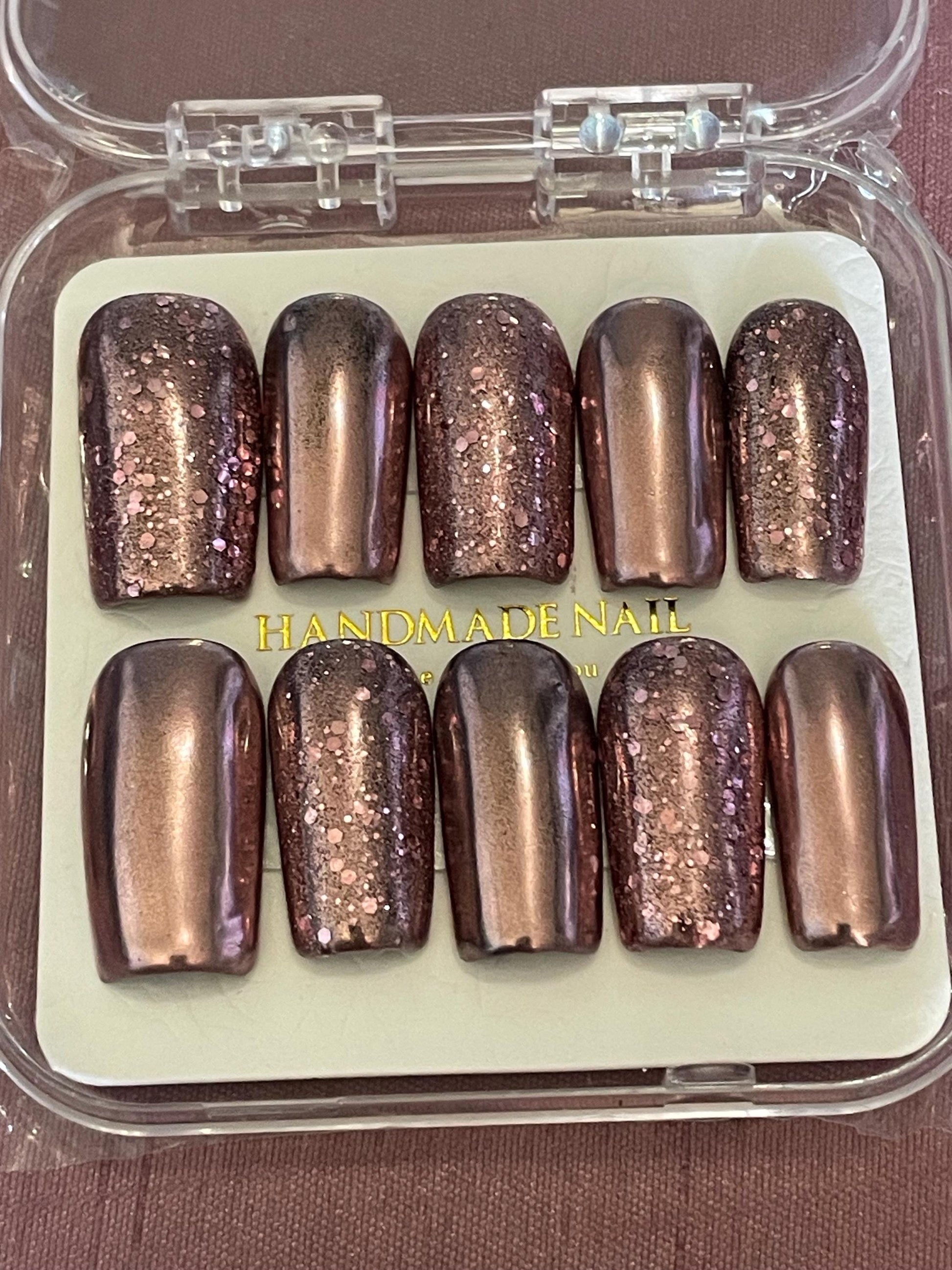 Chrome rose et paillettes. Réutilisable, Press-on nails, faux ongles. Finition brillante