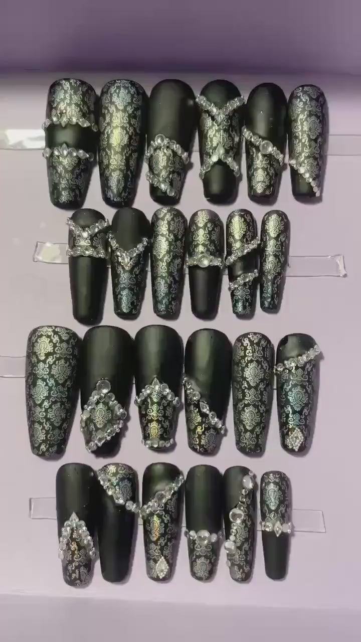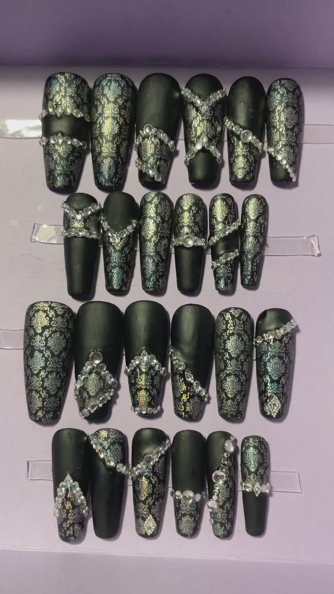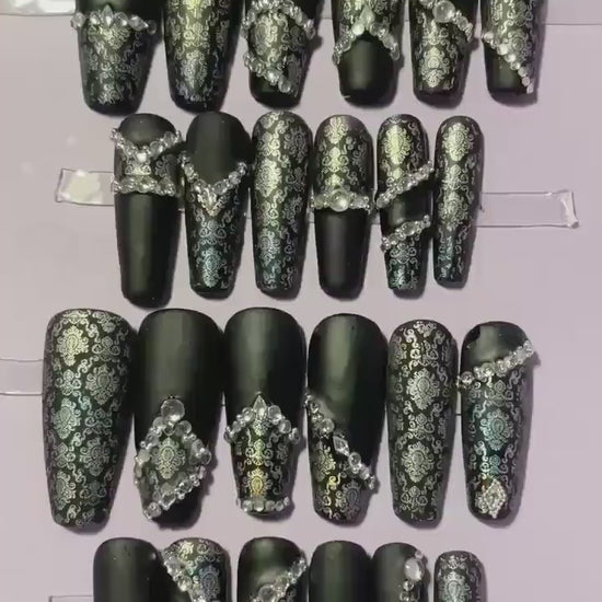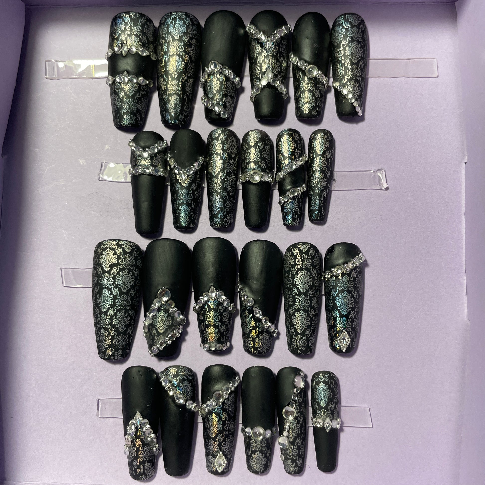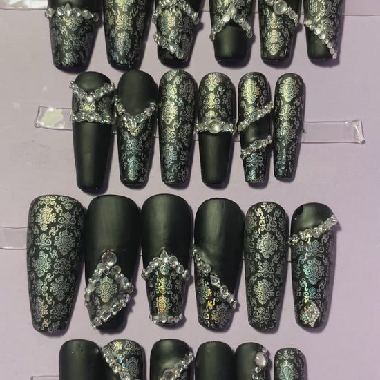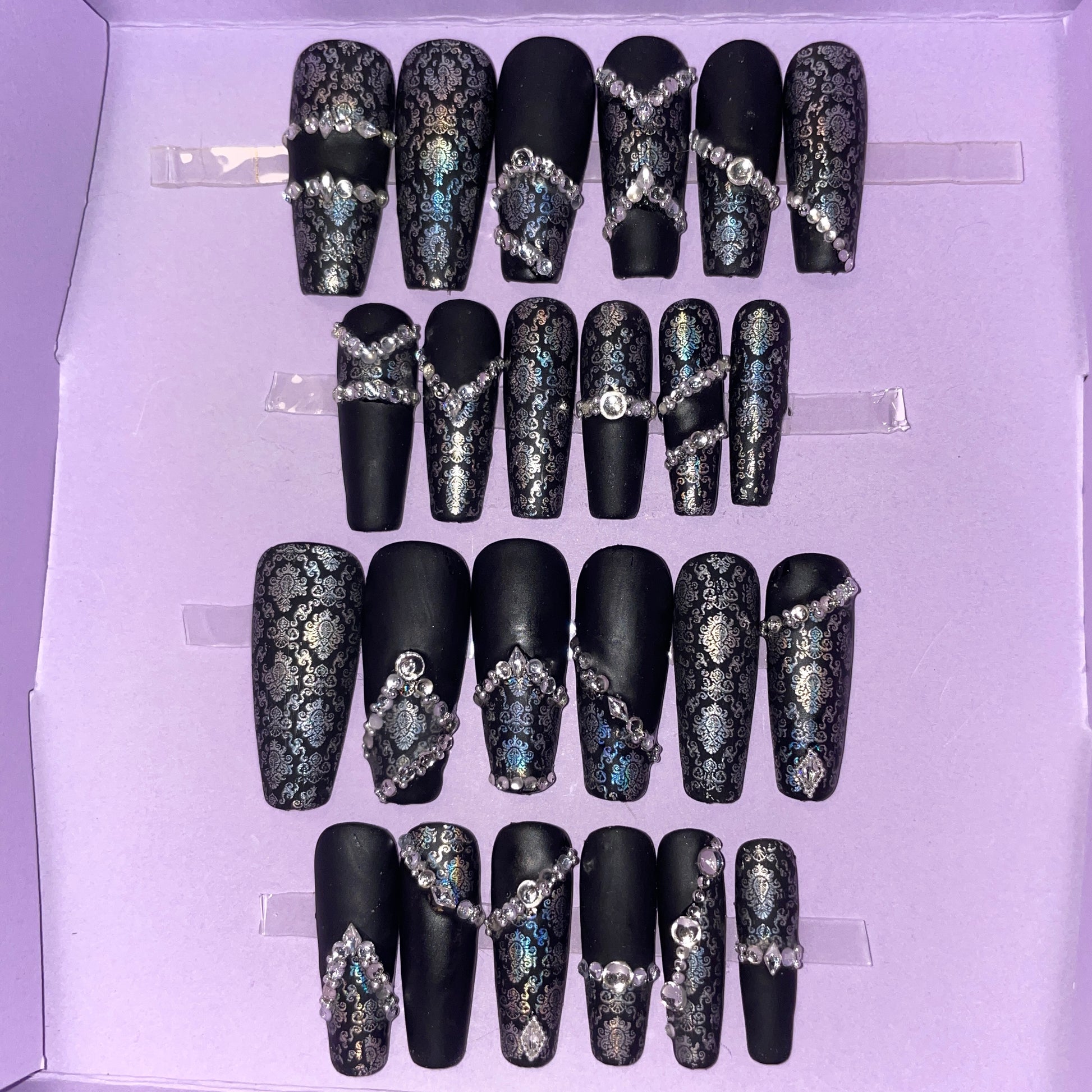 Noir mat et dentelle argent avec strass. Kit toutes tailles incluses. Réutilisables, Press-on nails, faux ongles