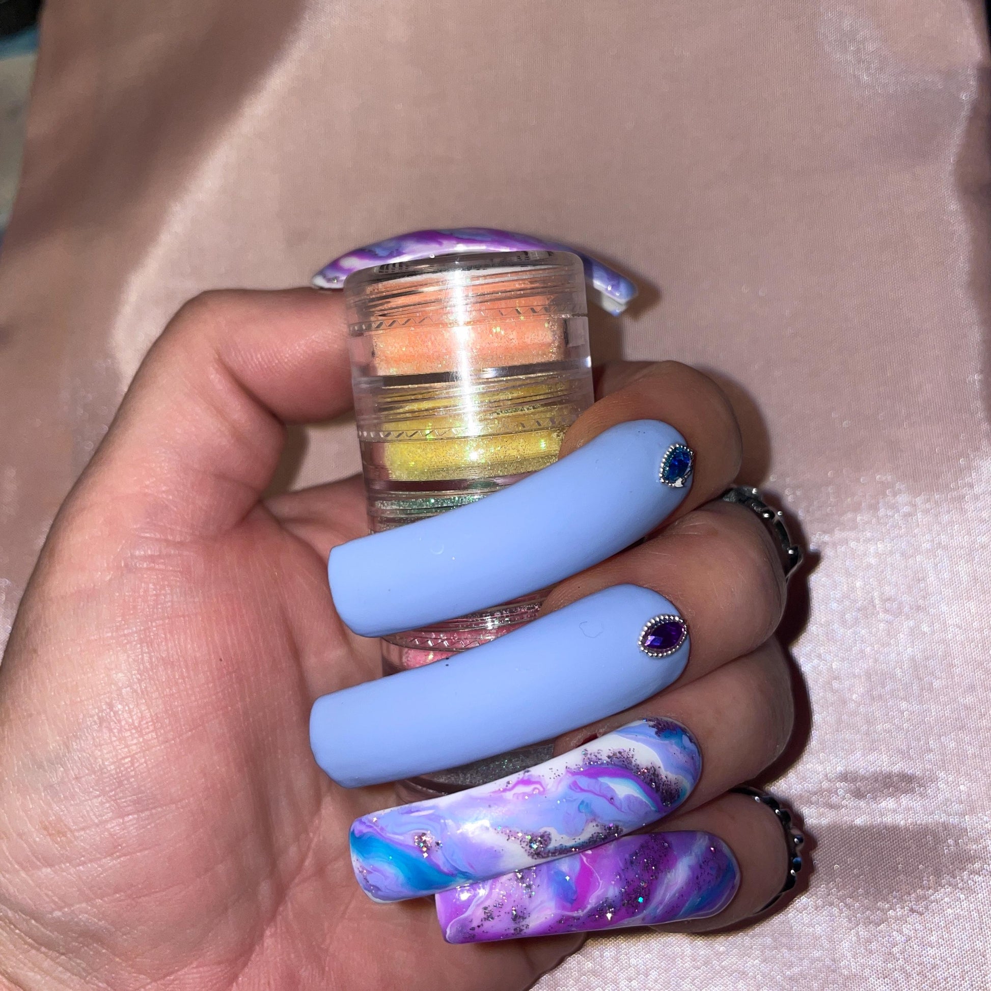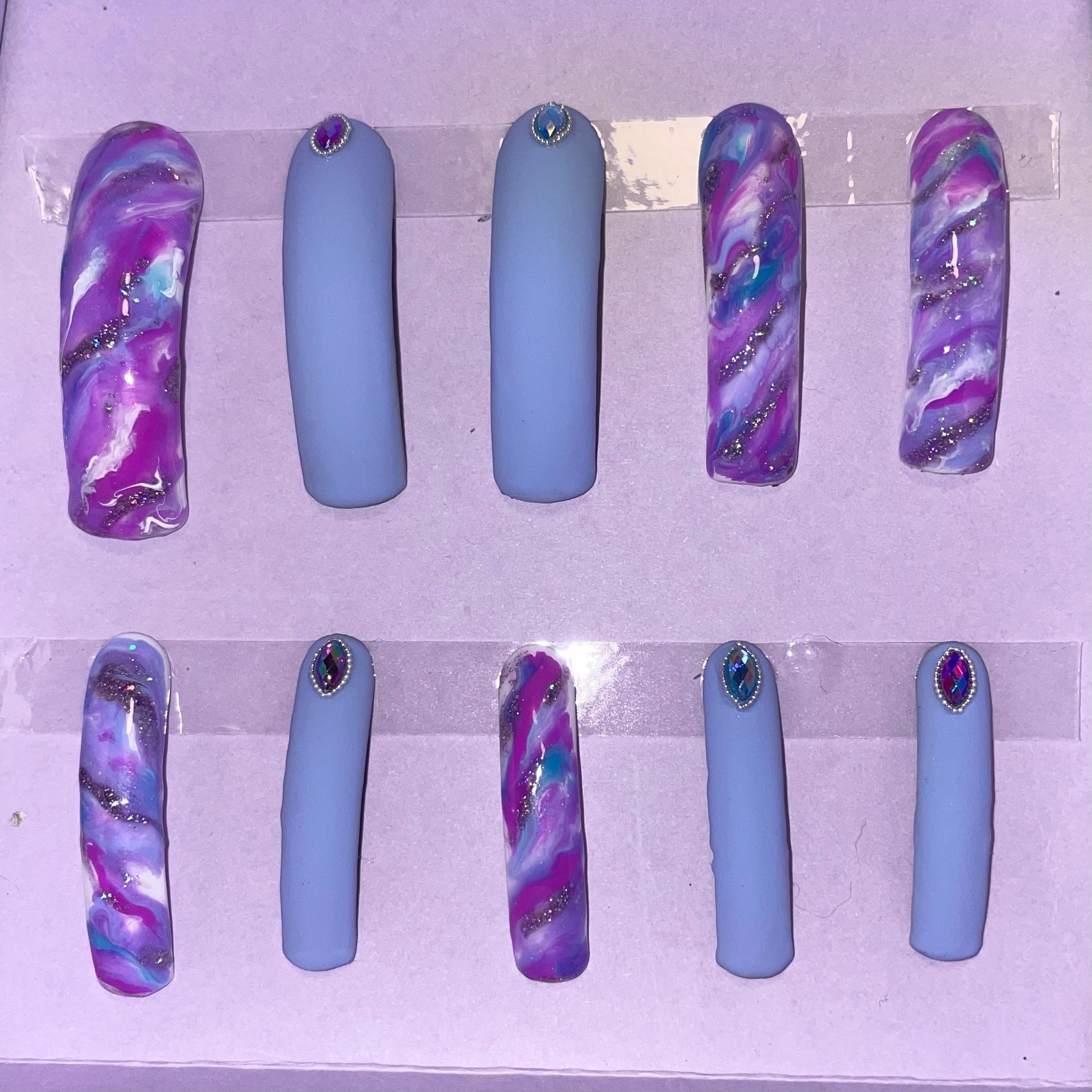 Marbre violet, rose, bleu avec strass. Kit toutes tailles incluses. Réutilisables, Press-on nails, faux ongles. Finition brillante et mate