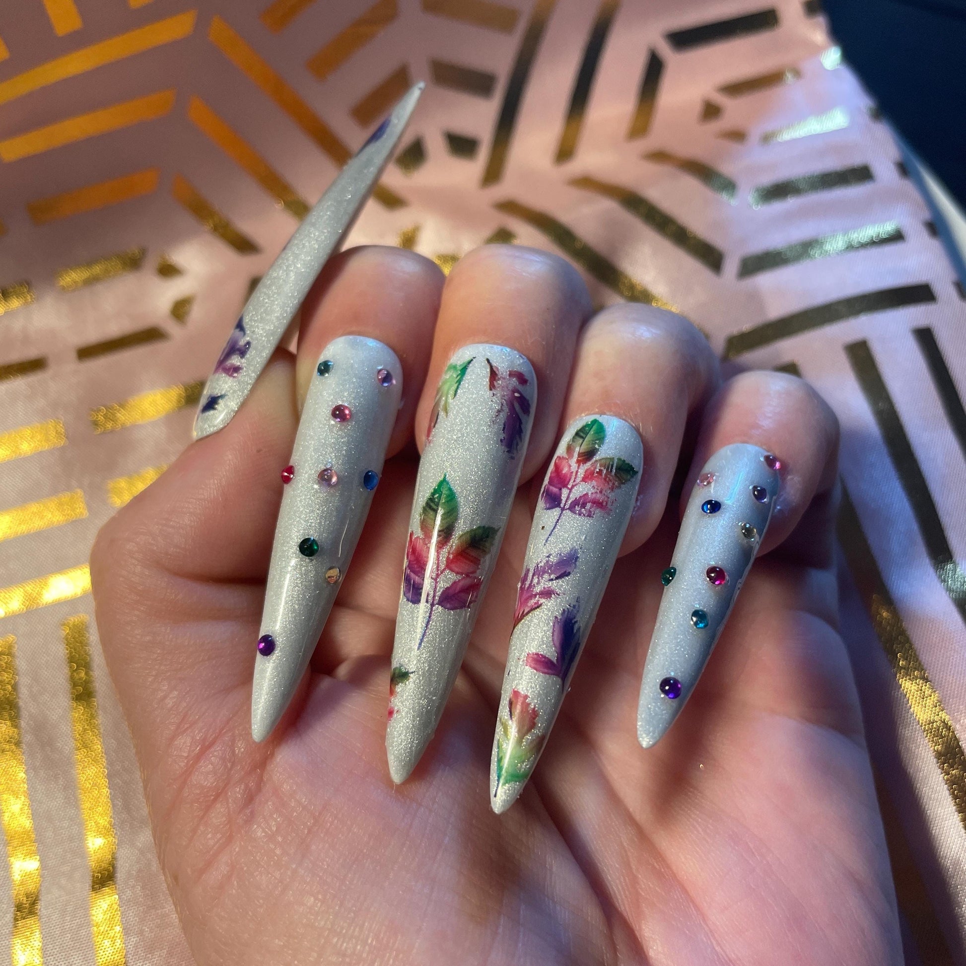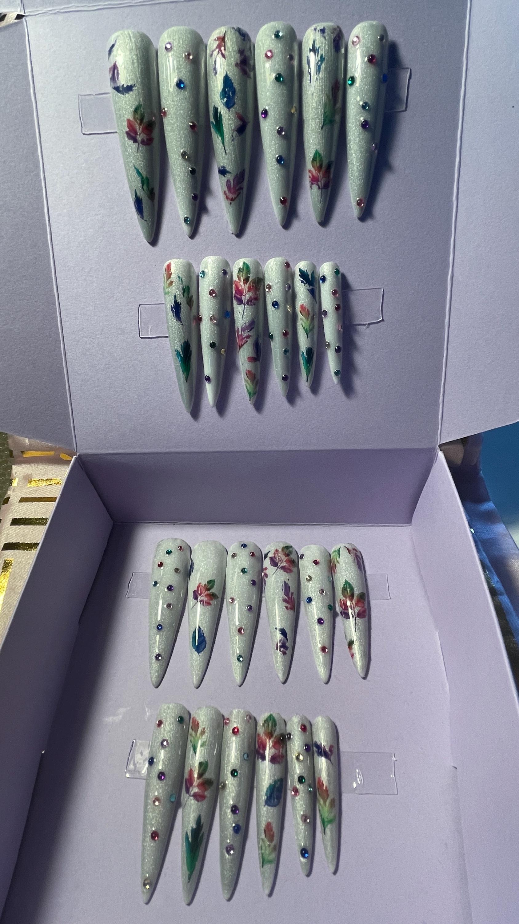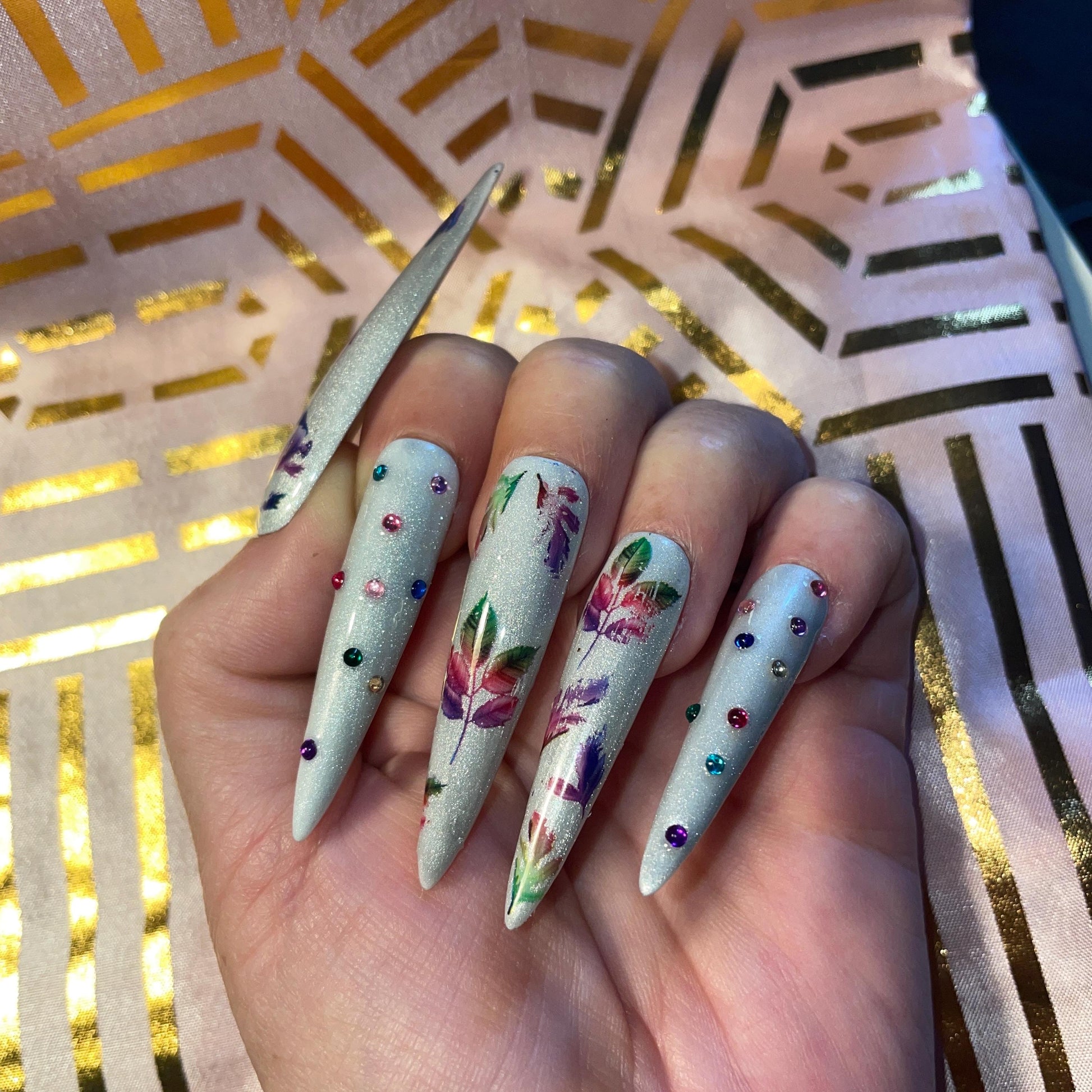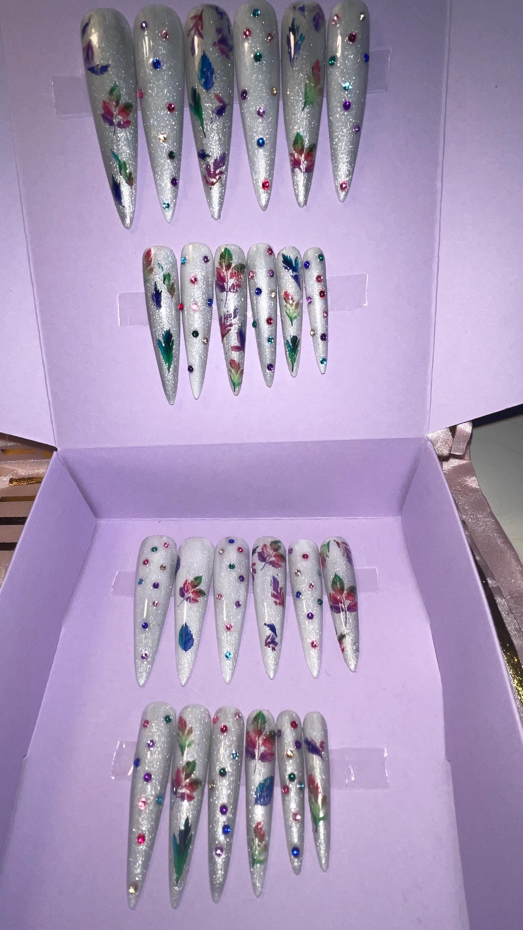 Blanc avec feuilles et strass arc-en-ciel. Kit toutes tailles incluses. Réutilisable, Press-on nails, faux ongles. Finition brillante.