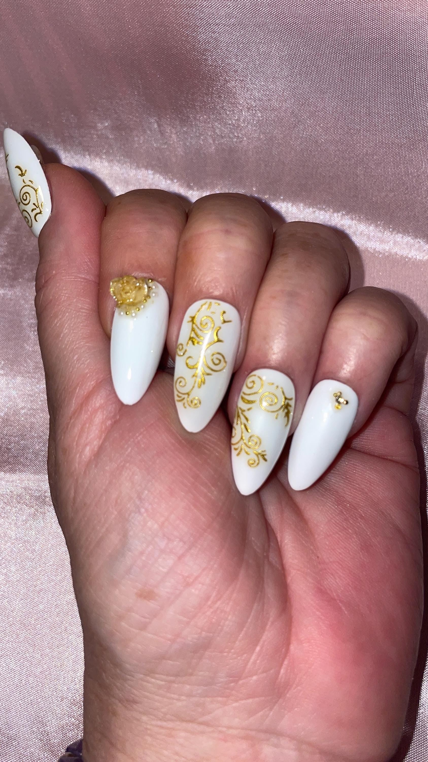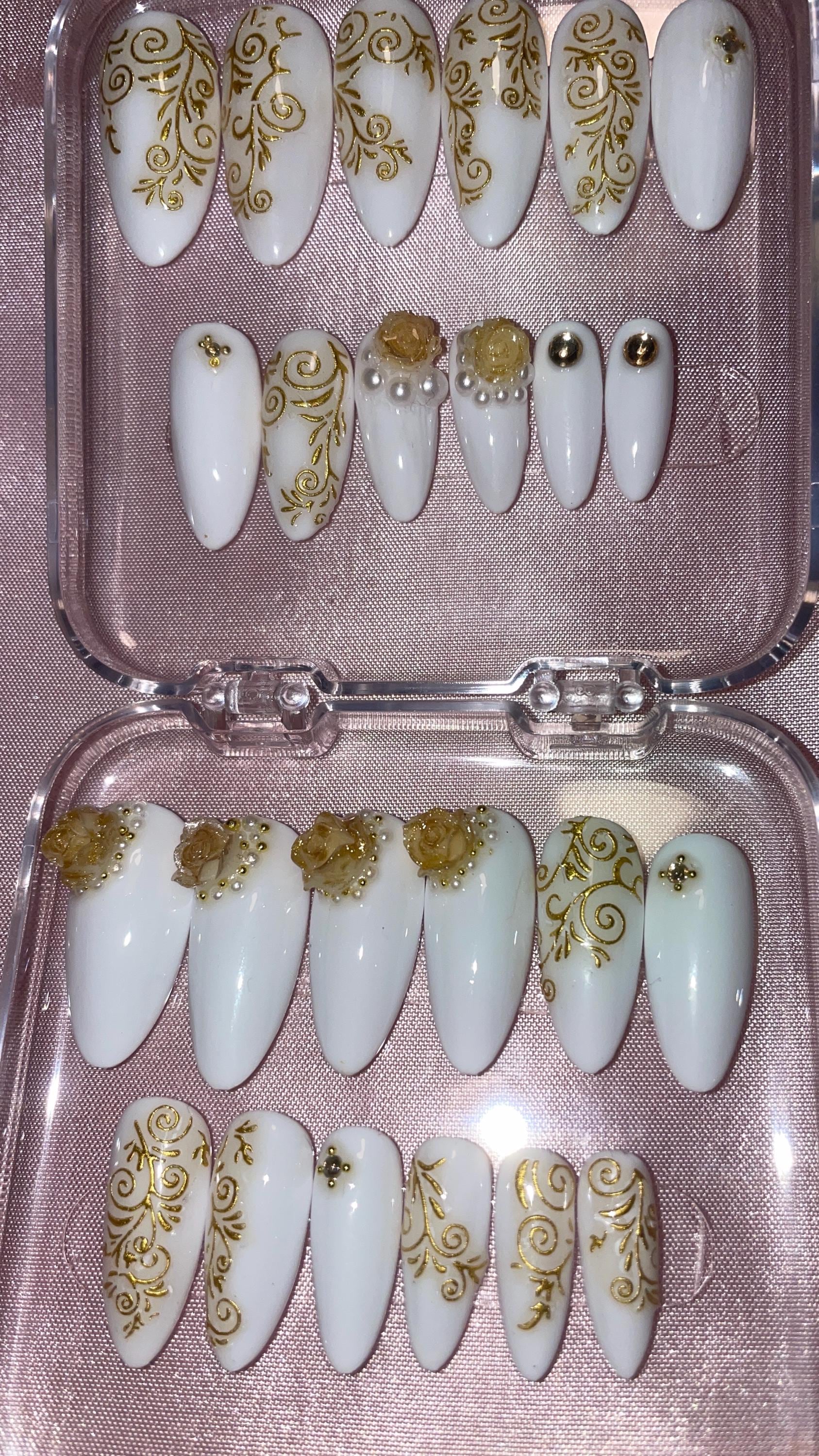 Blanc et doré, fleurs, perles et strass. Kit toutes tailles incluses. Réutilisables, Press-on nails, faux ongles, Finition brillante.