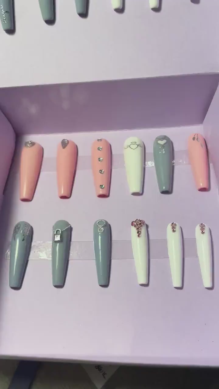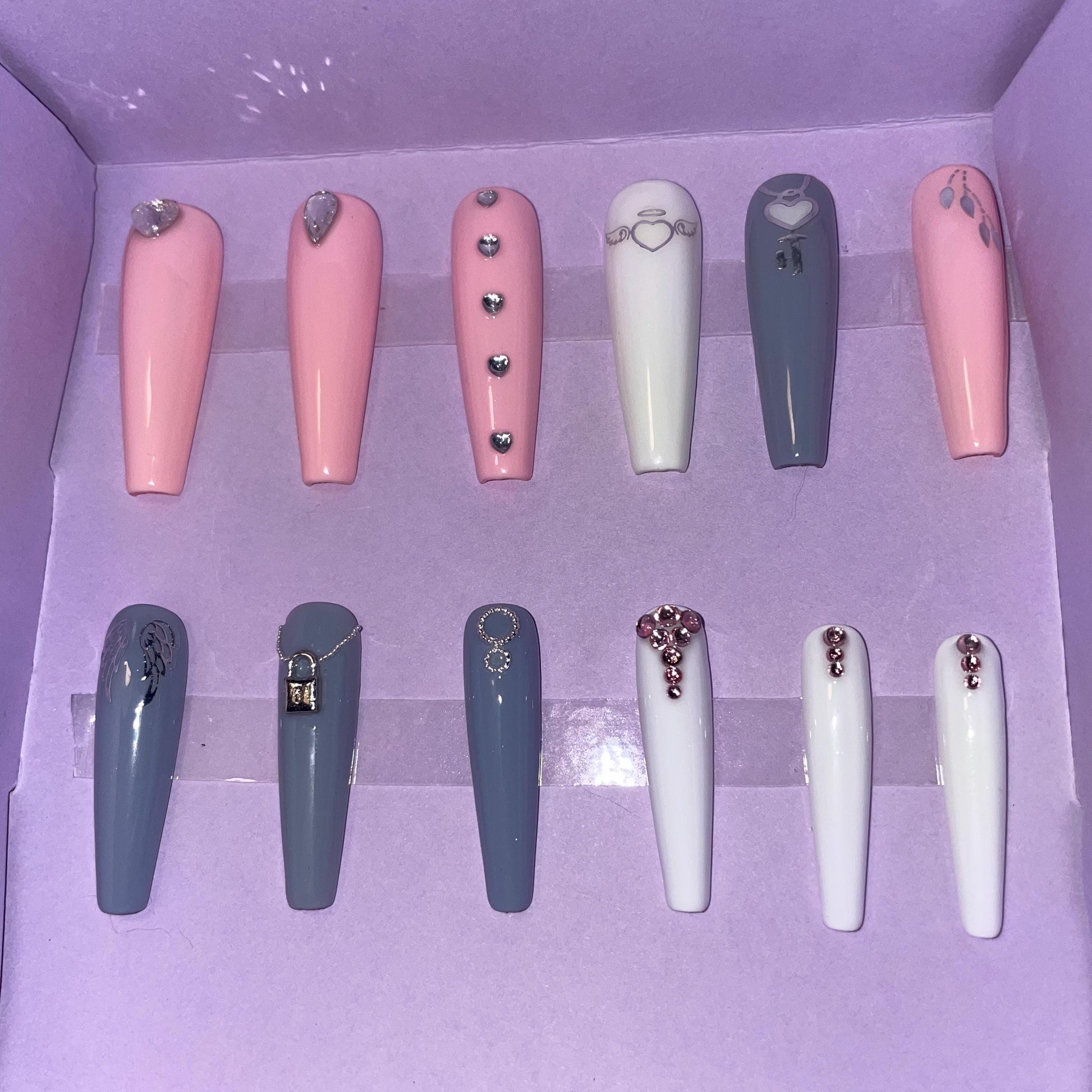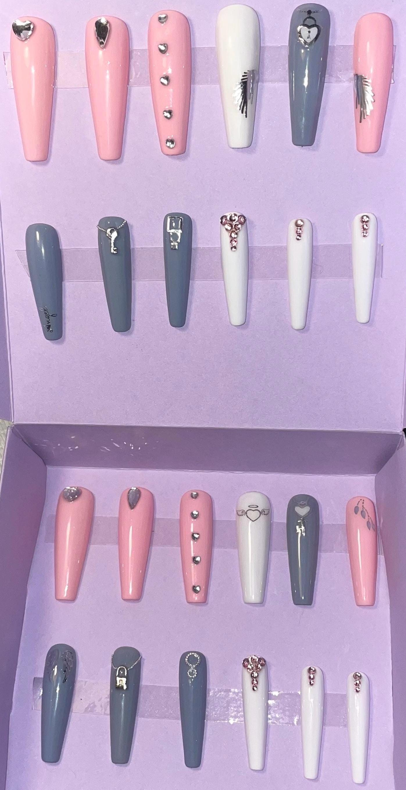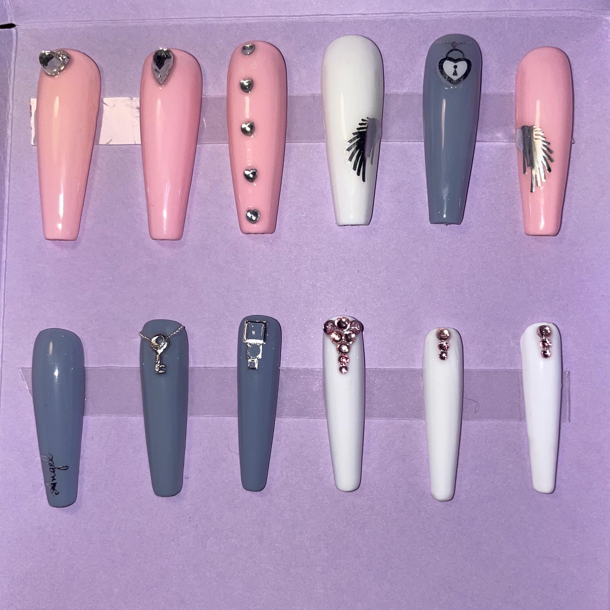 Rose, gris blanc avec petites clés et cadenas. Kit toutes tailles incluses. Réutilisables, Press-on nails, faux ongles. Finition brillante