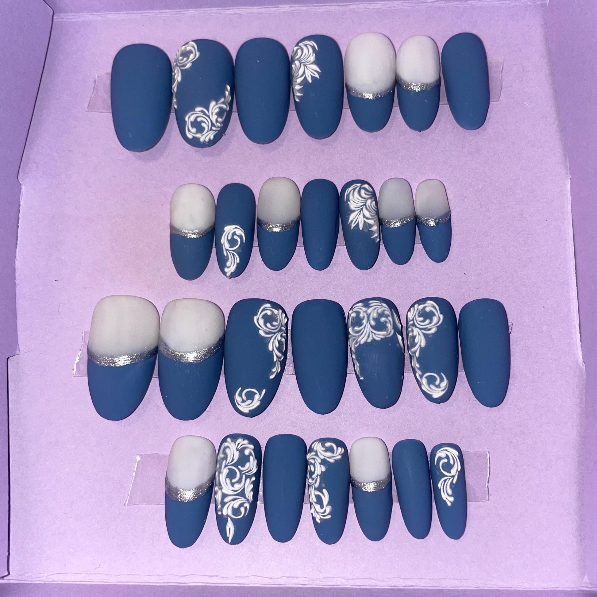 Dentelle blanche. Bleu mat, blanc laiteux, argent. Kit toutes tailles incluses. Réutilisables, Press-on nails, faux ongles, Finition mate
