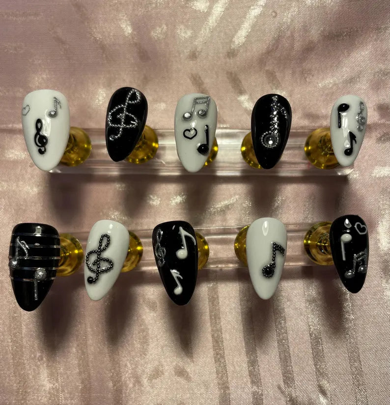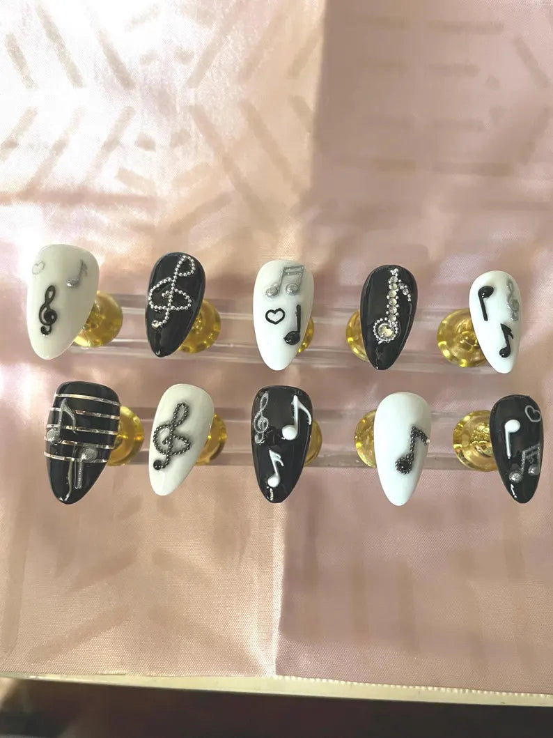 Quelques notes de musique, noir, blanc et argent. Réutilisable, Press-on nails, faux ongles. Finition brillante
