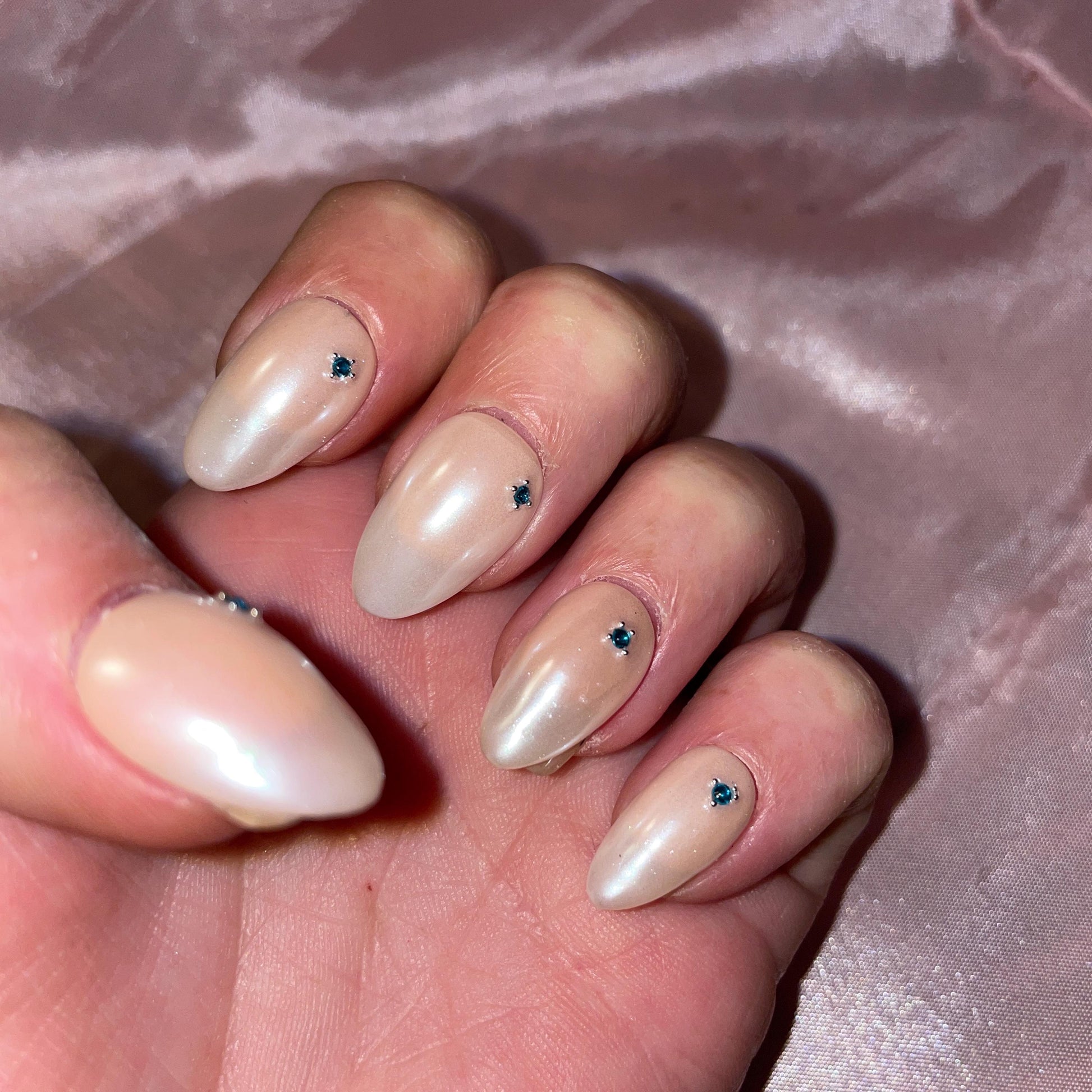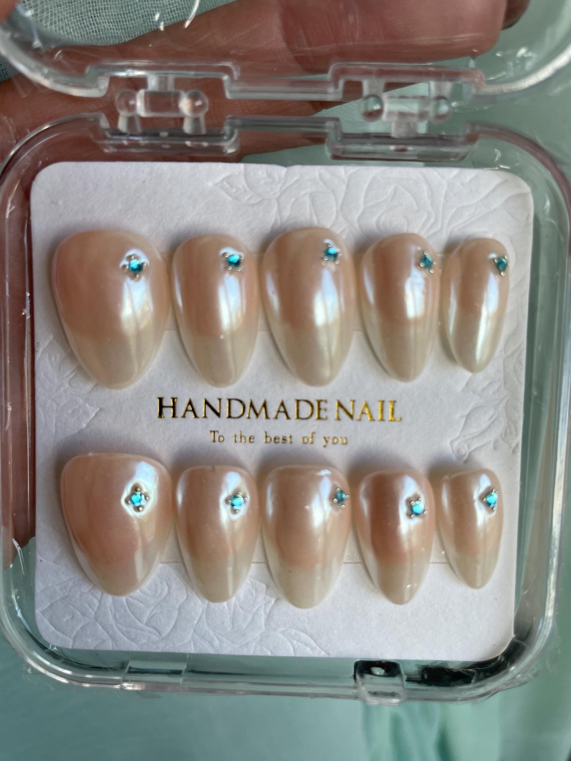 Prêt à expédier. Amande court. Taille L Nacré avec petit strass. Réutilisables, Press-on nails, faux ongles, Finition brillante.