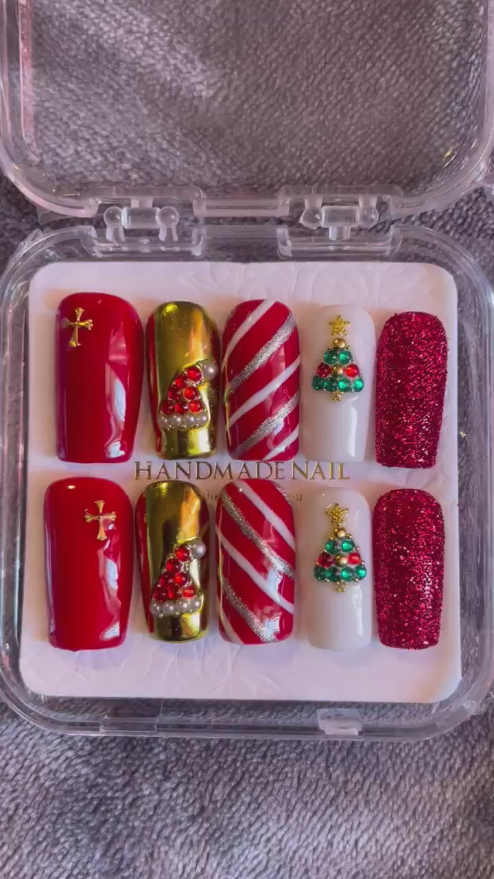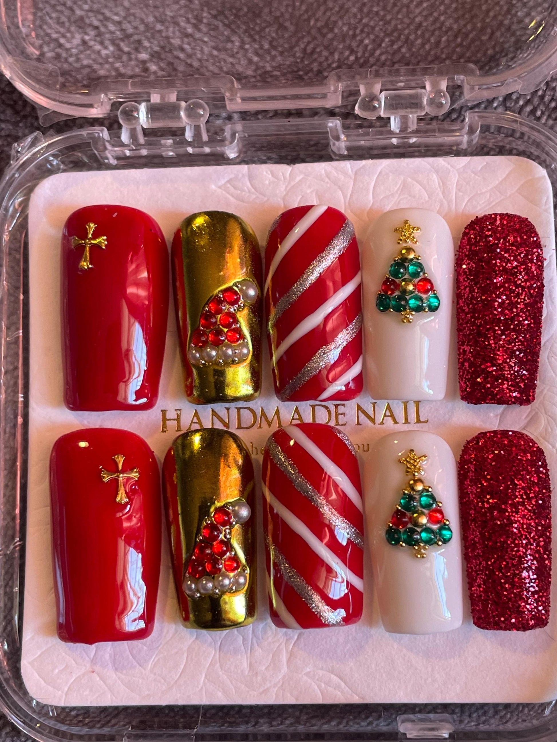 Noël rouge, or. Croix, bonnet et sapin de Noël. Réutilisable, Press-on nails, faux ongles. Finition brillante