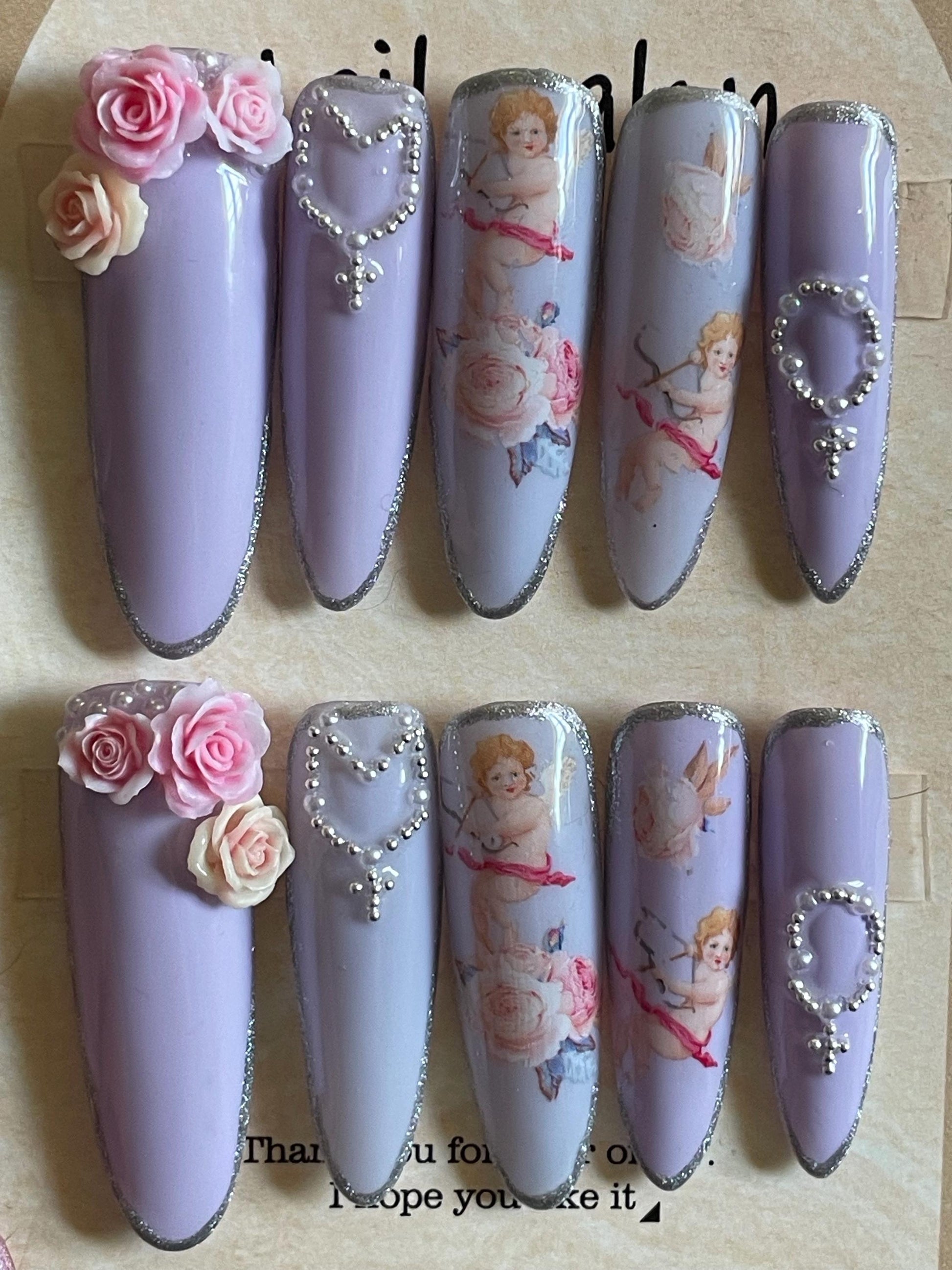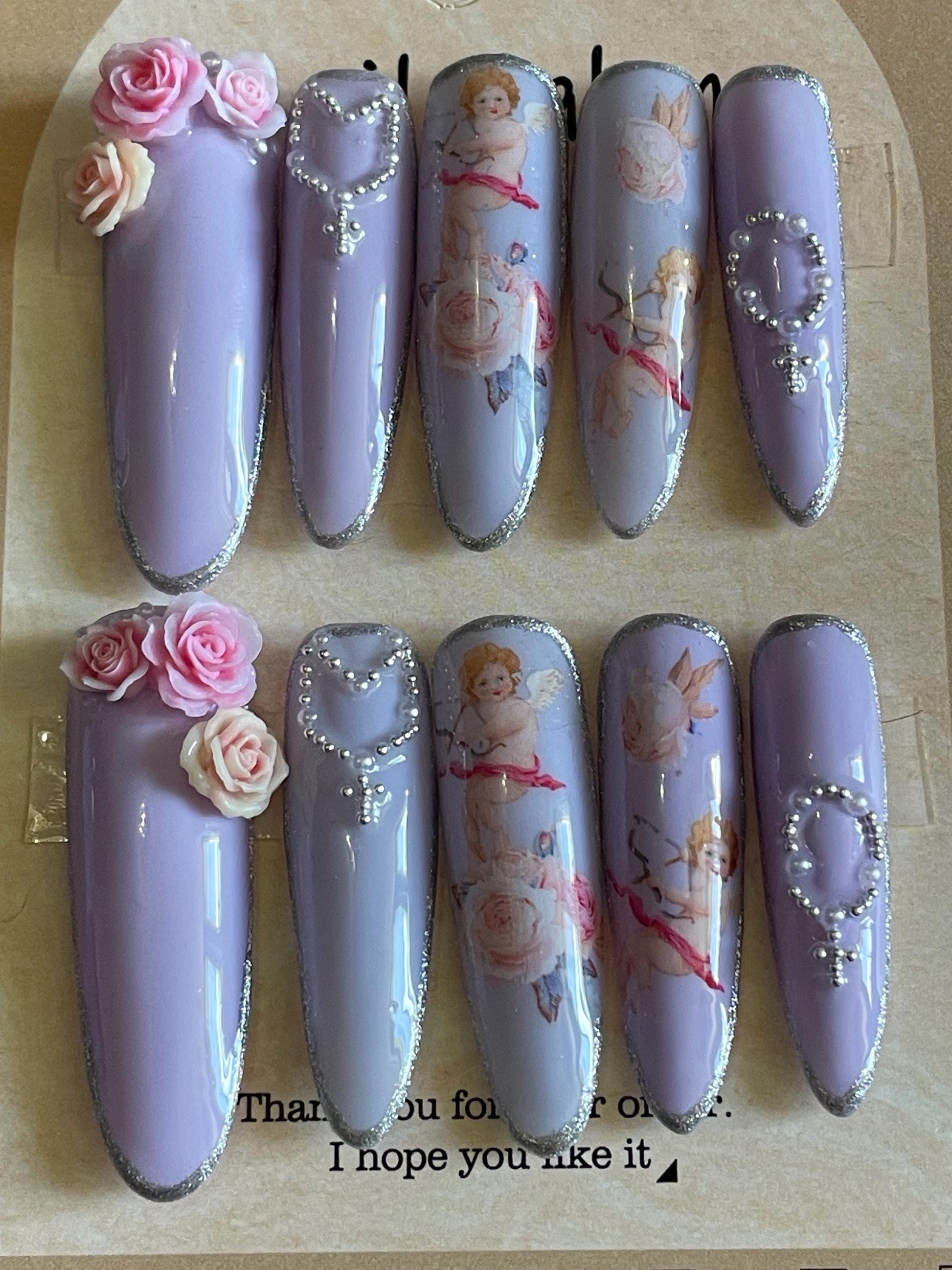Petits chérubins violet et argent avec chapelets et fleurs. Réutilisable, Press-on nails, faux ongles. Finition brillante