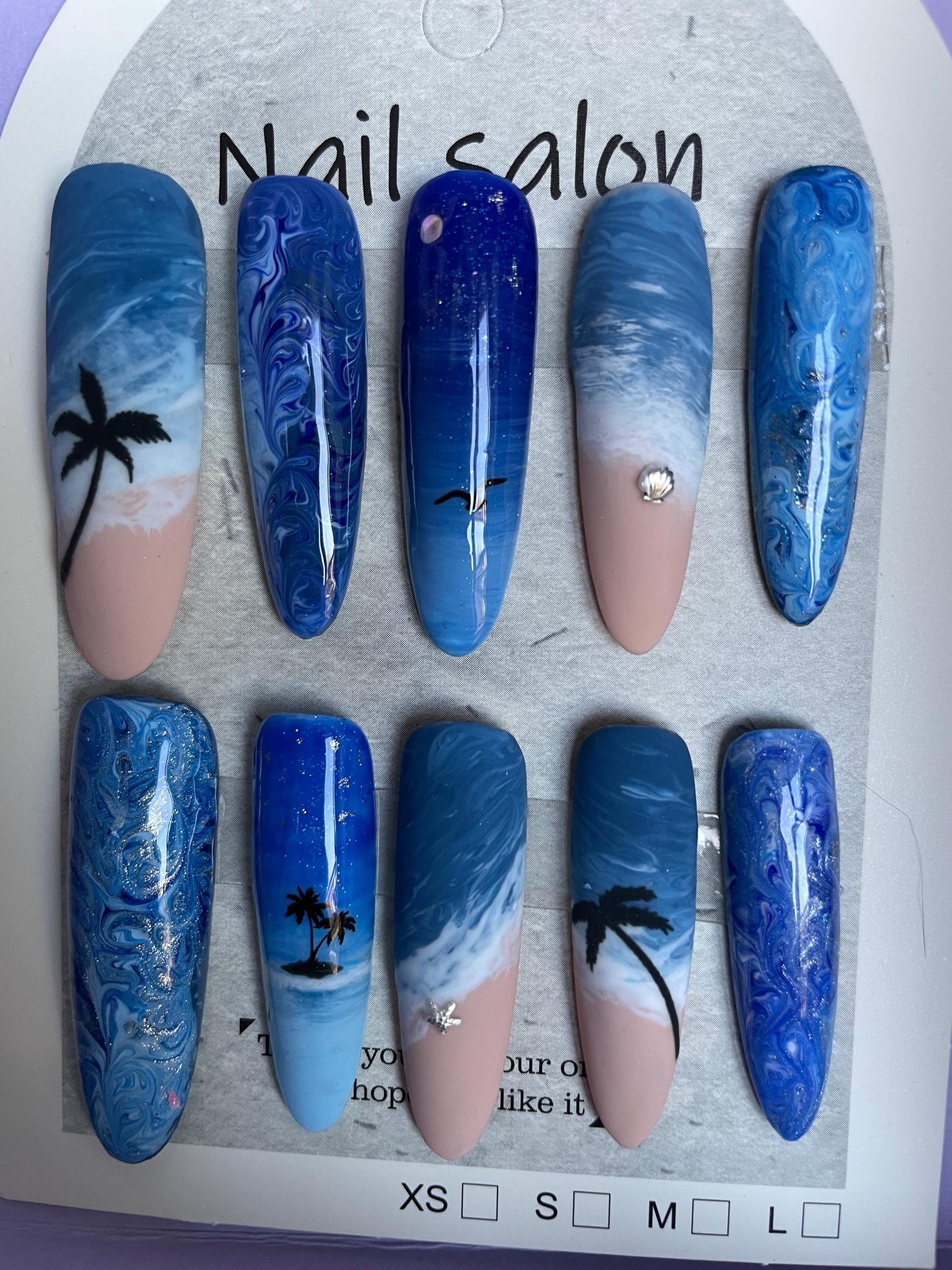 Plage avec palmiers, étoile et coquillage. Réutilisable, Press-on nails, faux ongles. Finition mate et brillante.