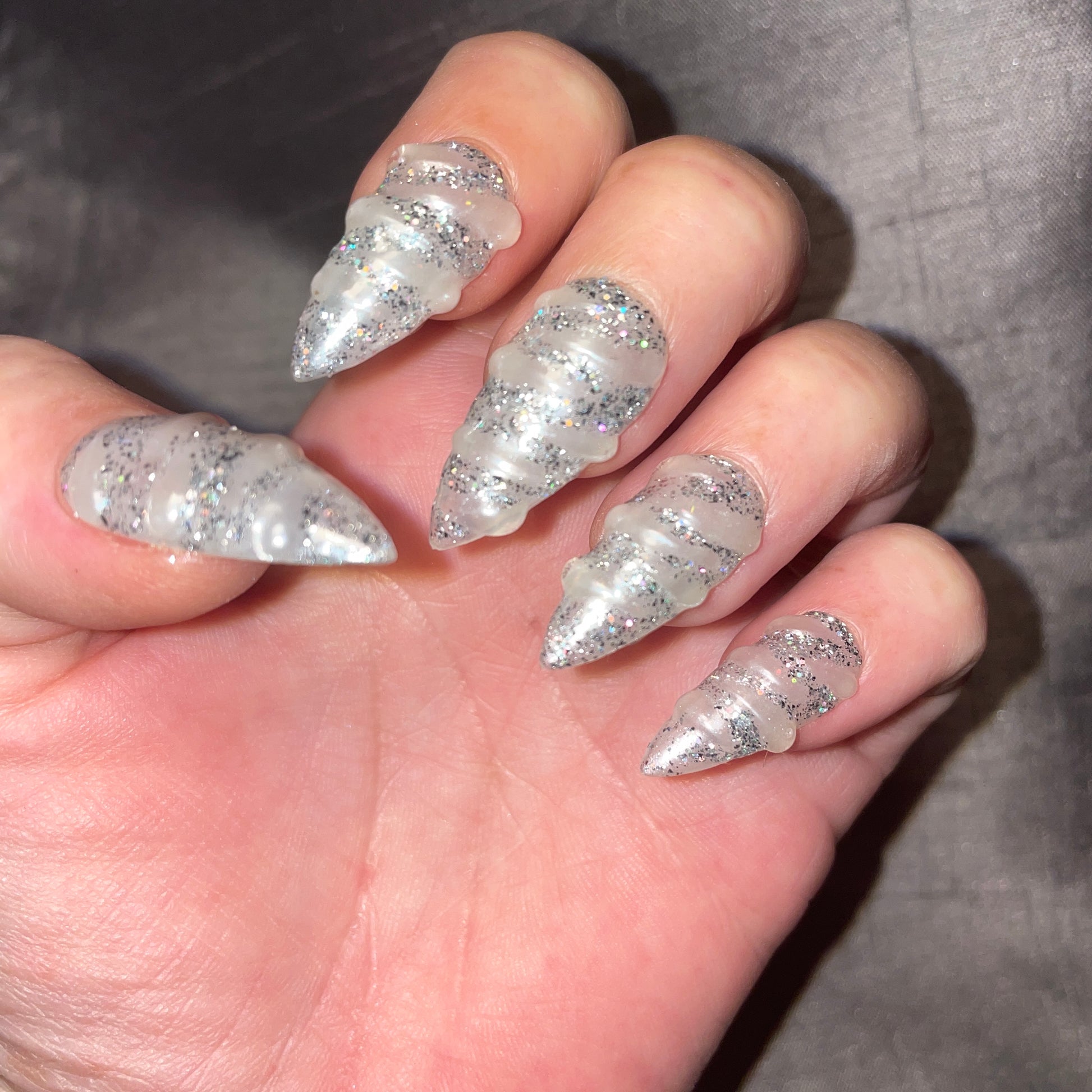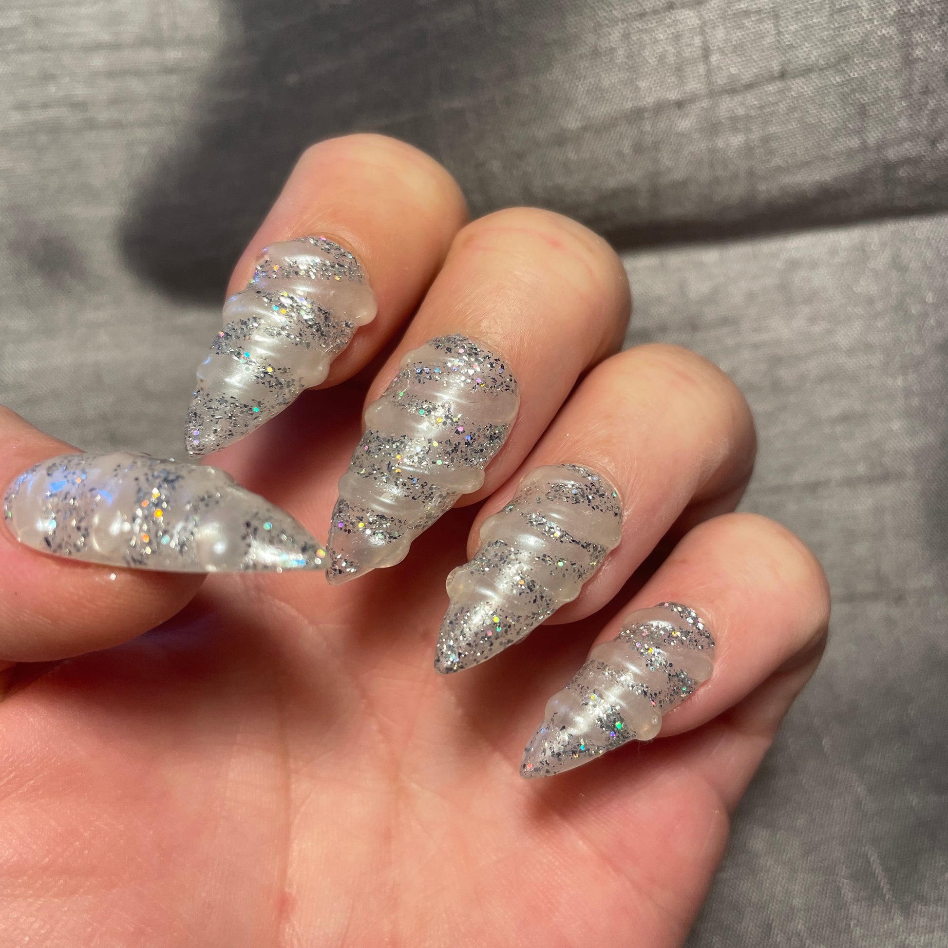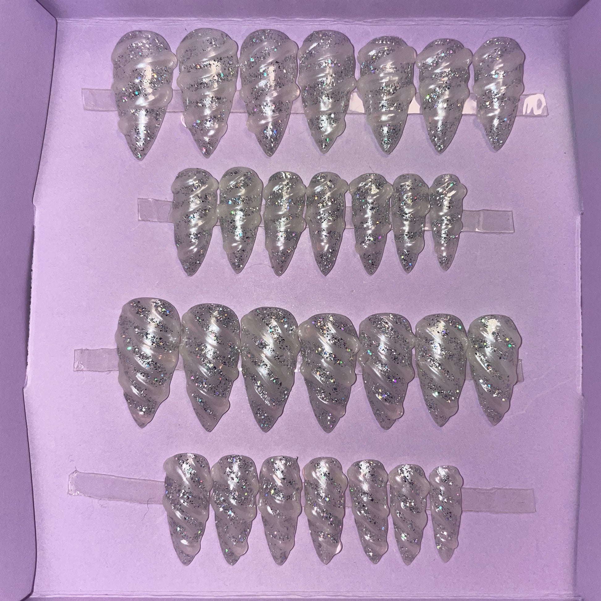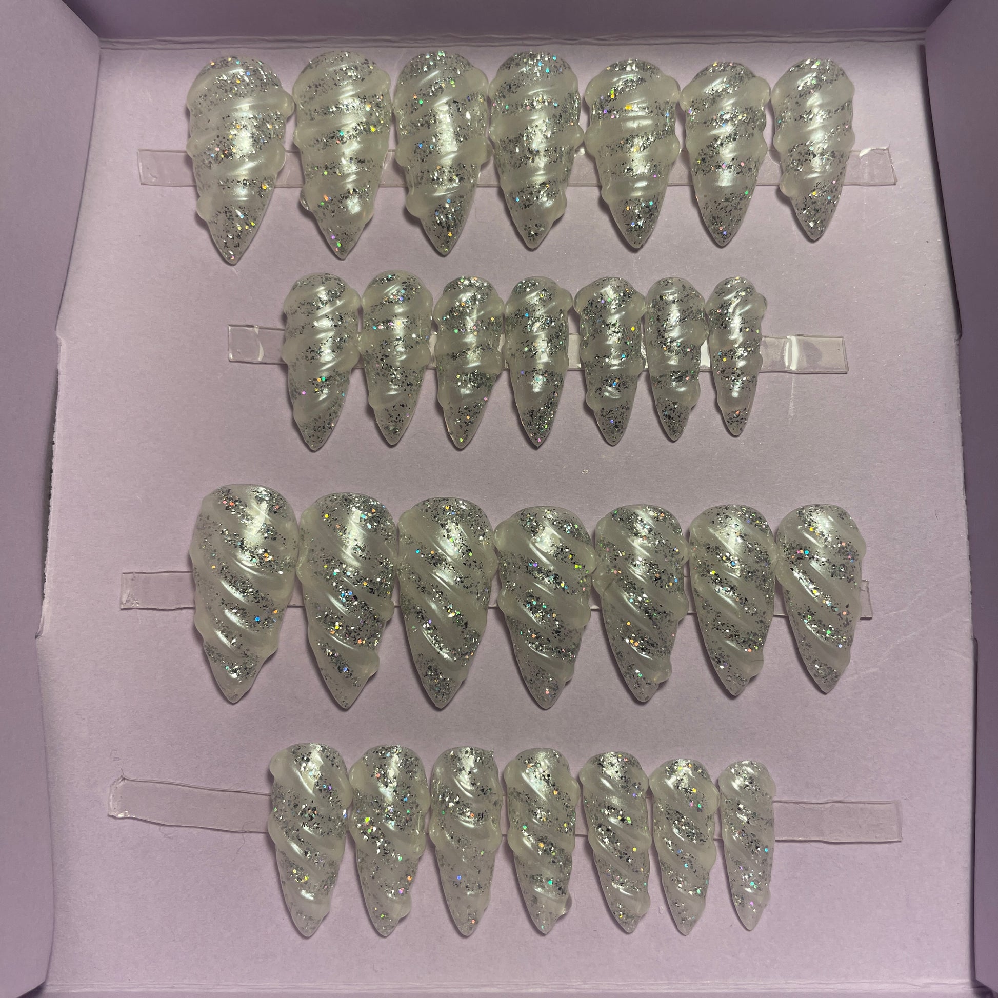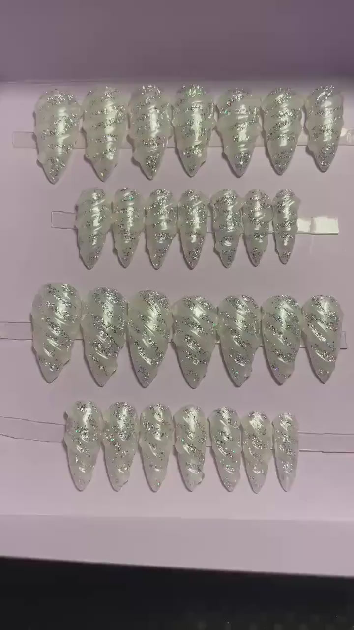 Blanc nacré et pailleté argent en relief. Kit toutes tailles incluses. Réutilisables, Press-on nails, faux ongles