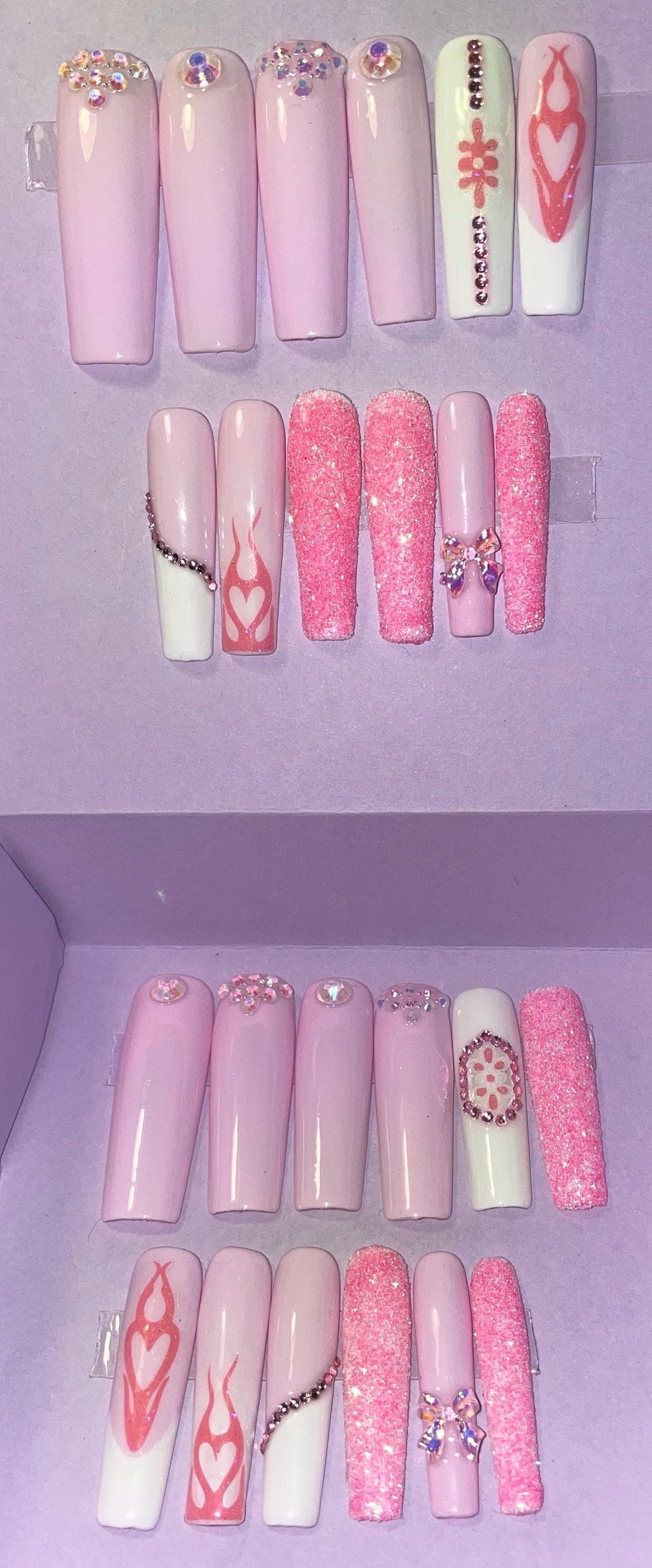 Roses et blancs avec flammes roses, strass, et sucre. Kit toutes tailles incluses. Réutilisables. Press-on nails, faux ongles. Finition brillante.