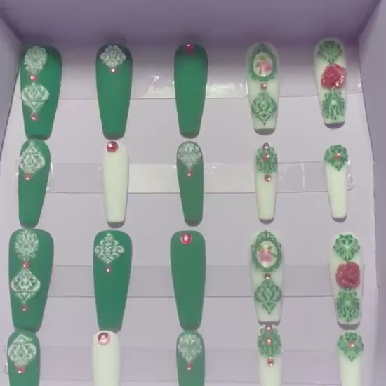 Vert, et blanc avec fleurs roses et strass. Kit complet toutes tailles incluses. Réutilisables, Press-on nails, faux ongles. Finition mate